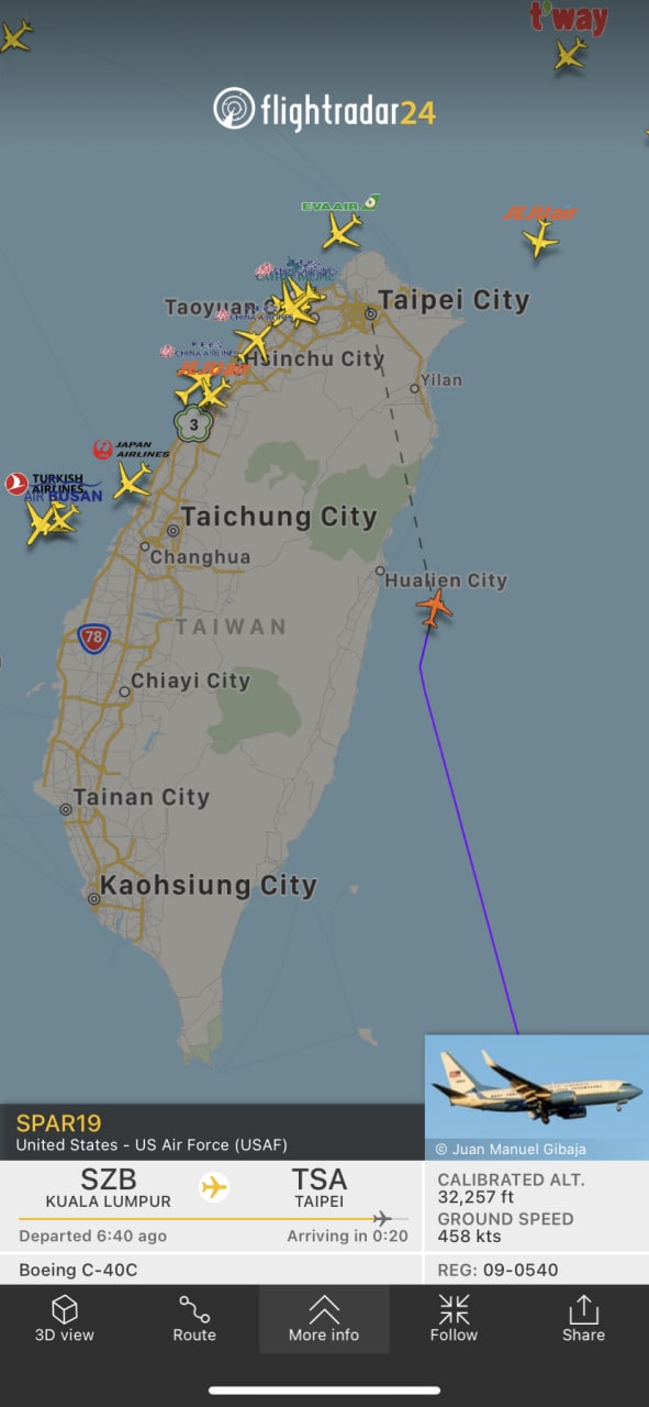 Внимание всего мира в эти минуты приковано к Тайваню. Самолет, на котором может находиться спикер палаты представителей США Нэнси Пелоси, пошел на снижение перед аэропортом Тайбэя, следует из данных Flightradar.