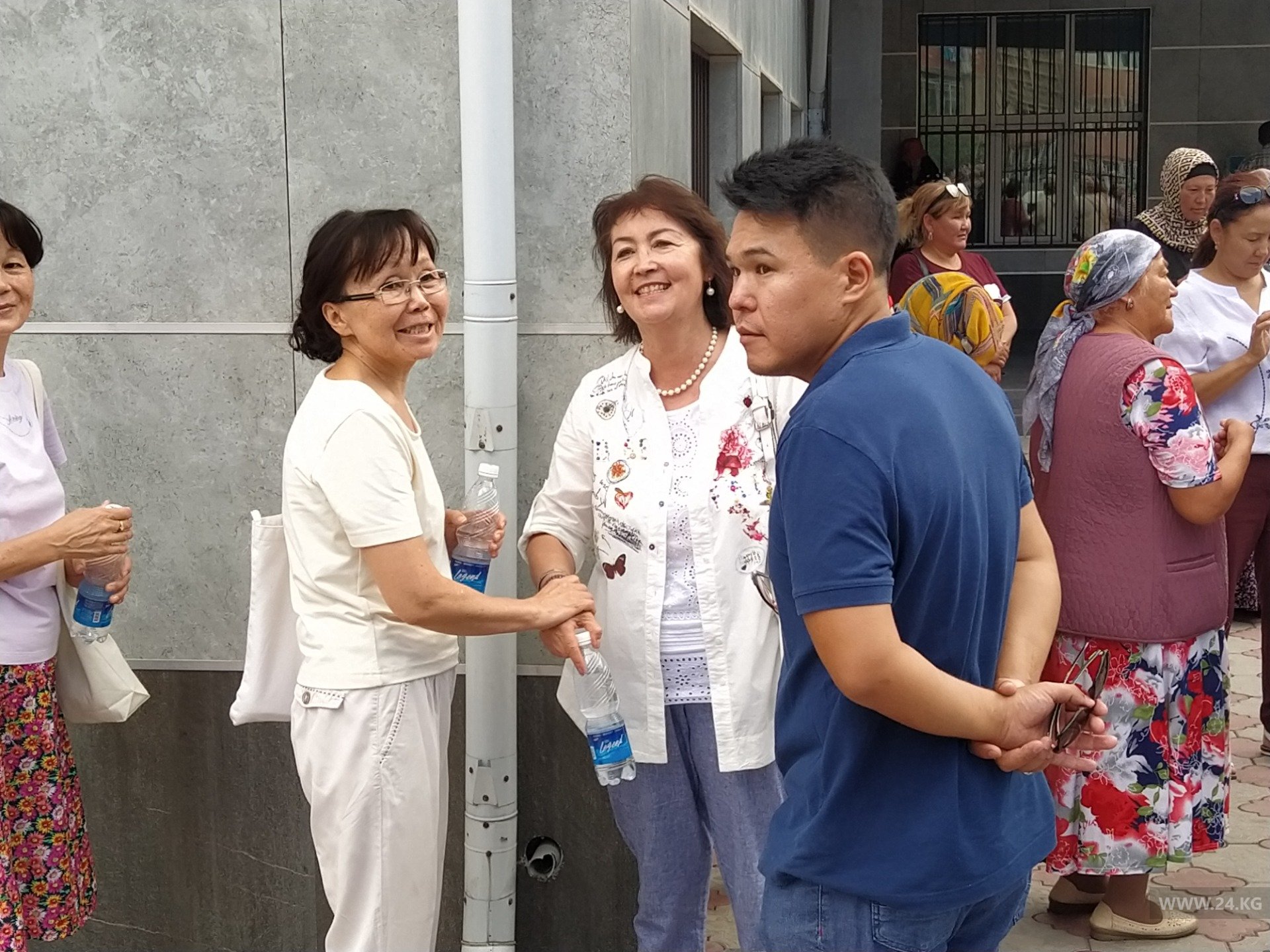 Участники акции держат в руках транспаранты и плакаты. Охраняющие здание суда сотрудники милиции потребовали вынести знамена и провести акцию за забором. В спор вмешались супруга обвиняемого Раиса Атамбаева и экс-депутат Жогорку Кенеша Ирина Карамушкина. После непродолжительного спора милиционеры уступили.