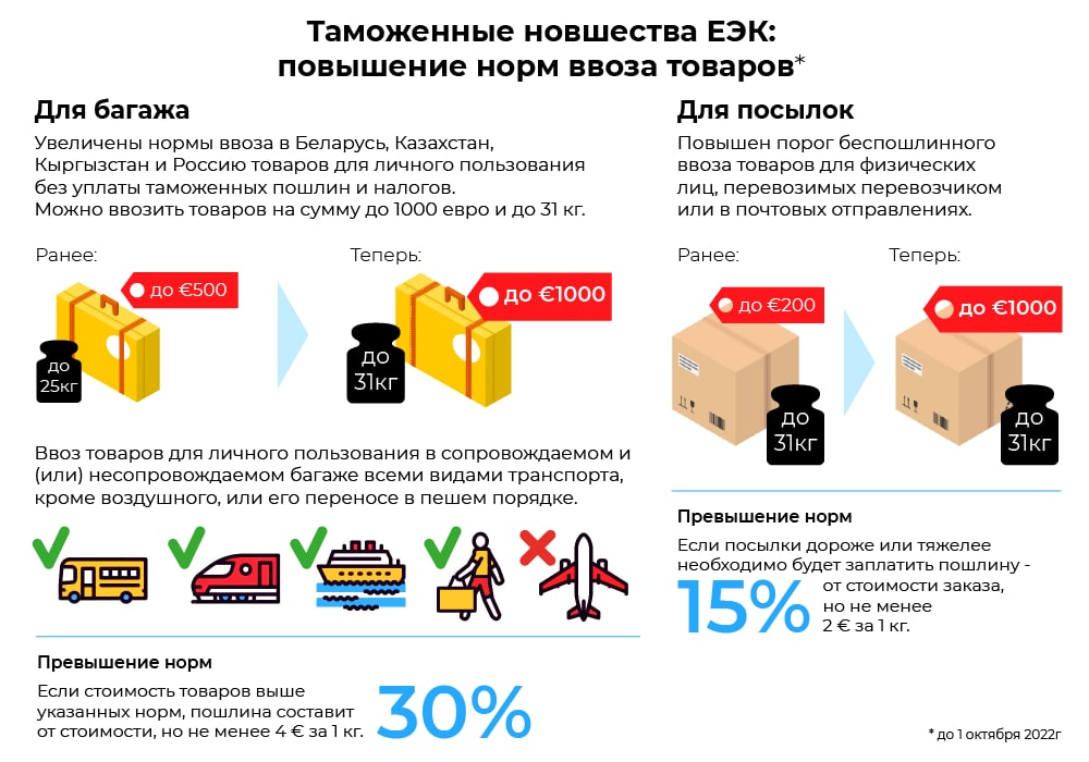 До 1 октября 2022 года в ЕАЭС не будут взиматься пошлины за ввоз товаров личного пользования стоимостью до 1 тысячи евро и весом до 31 килограмма. Об этом сообщает пресс-служба Евразийской экономической комиссии.