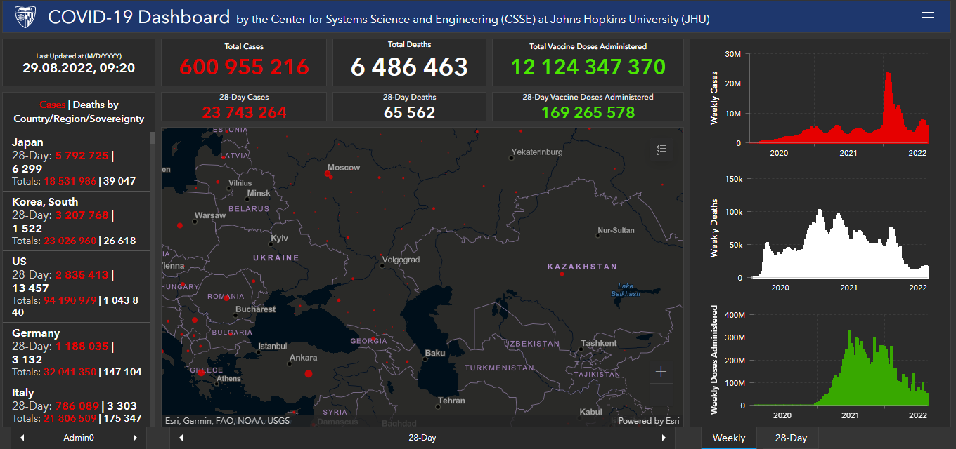 Всего в мире с начала пандемии коронавирусом заразились 600 миллионов 955 тысяч 216 человек. Больше всего в США (94 миллиона 190 тысяч 979), Индии (44 миллиона 408 тысяч 132), Бразилии (34 миллиона 368 тысяч 909), Франции (34 миллиона 662 тысячи 834), Великобритании (23 миллиона 708 тысяч 729), России (19 миллионов 123 тысячи 501), Турции (16 миллионов 671 тысяча 848), Аргентине (9 миллионов 678 тысяч 255), Иране (7 миллионов 523 тысячи 662), Колумбии (6 миллионов 299 тысяч 595), Испании (13 миллионов 332 тысячи 976), Италии (21 миллион 806 тысяч 509) и Германии (32 миллиона 41 тысяча 350).