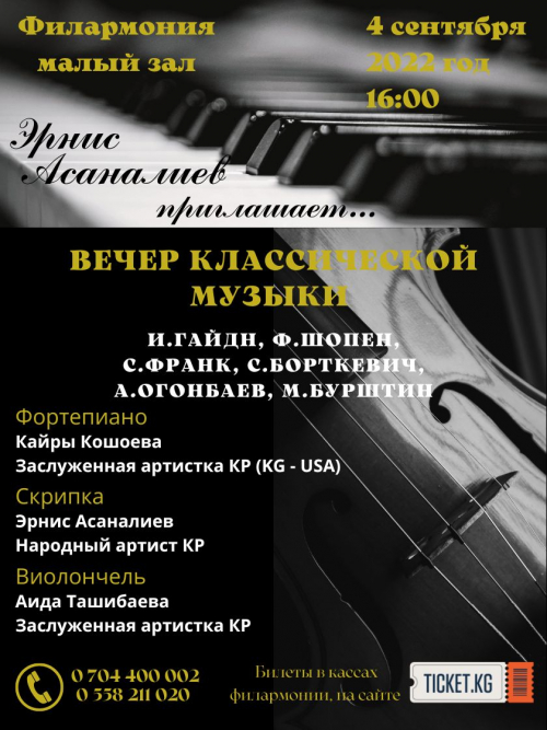 Прозвучат произведения композиторов Иозефа Гайдна, Фридерика Шопена, Семена Франка, Сергея Борткевича, Атая Огонбаева, Михаила Бурштина.
