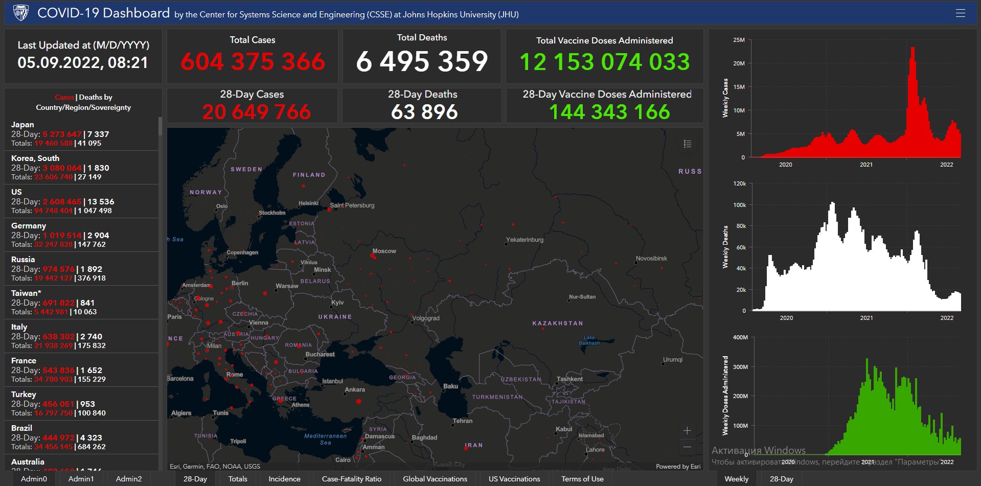 Всего в мире с начала пандемии коронавирусом заразились 604 миллиона 375 тысяч 366 человек. Больше всего в США (94 миллиона 748 тысяч 404), Индии (44 миллиона 456 тысяч 535), Бразилии (34 миллиона 456 тысяч 145), Франции (34 миллиона 780 тысяч 903), Великобритании (23 миллиона 738 тысяч 76), России (19 миллионов 442 тысячи 127), Турции (16 миллионов 797 тысяч 750), Аргентине (9 миллионов 689 тысяч 861), Иране (7 миллионов 533 тысячи 87), Колумбии (6 миллионов 302 тысячи 809), Испании (13 миллионов 352 тысячи 19), Италии (21 миллион 938 тысяч 269) и Германии (32 миллиона 247 тысяч 828).