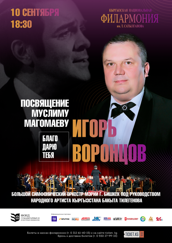В программе концерта самые известные и любимые хиты из репертуара Муслима Магомаева в исполнении Игоря Воронцова и Большого симфонического оркестра мэрии Бишкека под руководством народного артиста Кыргызстана Бакыта Тилегенова. Подробнее