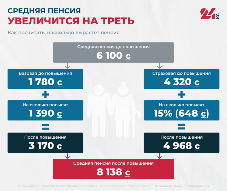 Если сегодня человек получает среднюю пенсию в 6 тысяч 100 сомов, надо от суммы отнять 1 тысячу 780 сомов (базовую часть). Получается, что страховая часть пенсии — 4 тысячи 320 сомов. Эту сумму умножаем на 15 процентов. Получается, что прибавка будет 648 сомов. Таким образом, страховая часть составит 4 тысячи 968. Для окончательного расчета прибавляем 3 тысячи 170 сомов (базовую часть после увеличения) и получаем 8 тысяч 138 сомов.