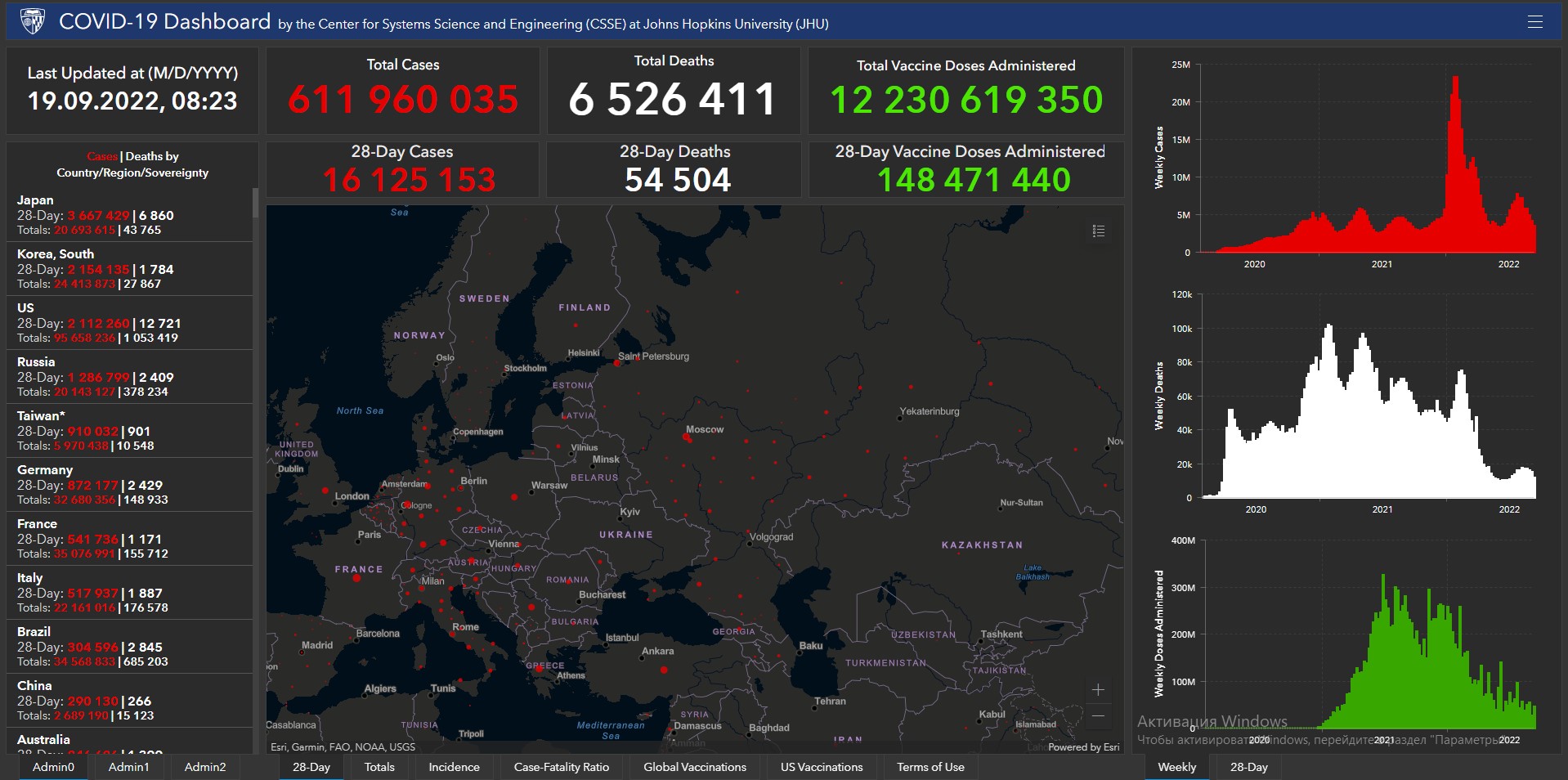 Всего в мире с начала пандемии коронавирусом заразились 611 миллионов 960 тысяч 35 человек. Больше всего в США (95 миллионов 658 тысяч 236), Индии (44 миллиона 534 тысячи 188), Бразилии (34 миллиона 568 тысяч 833), Франции (35 миллионов 76 тысяч 991), Великобритании (23 миллиона 803 тысячи 311), России (20 миллионов 143 тысячи 127), Турции (16 миллионов 852 тысячи 382), Аргентине (9 миллионов 703 тысячи 938), Иране (7 миллионов 542 тысячи 822), Колумбии (6 миллионов 305 тысяч 562), Испании (13 миллионов 384 тысячи 876), Италии (22 миллиона 161 тысяча 16) и Германии (32 миллиона 680 тысяч 356).