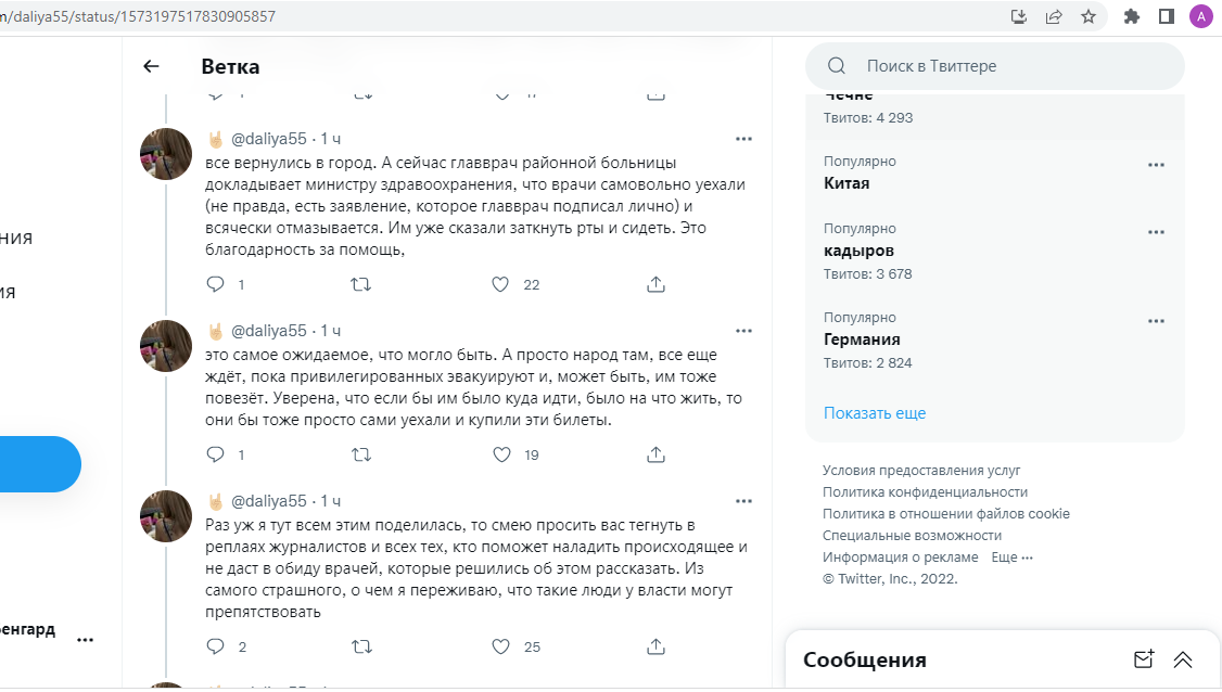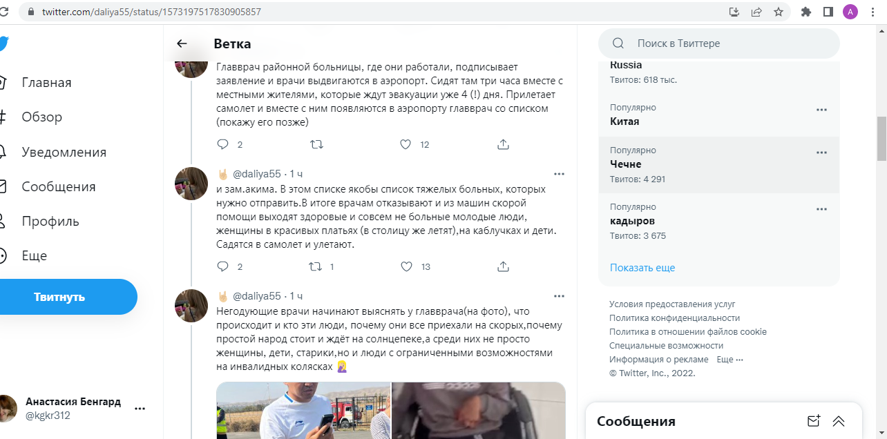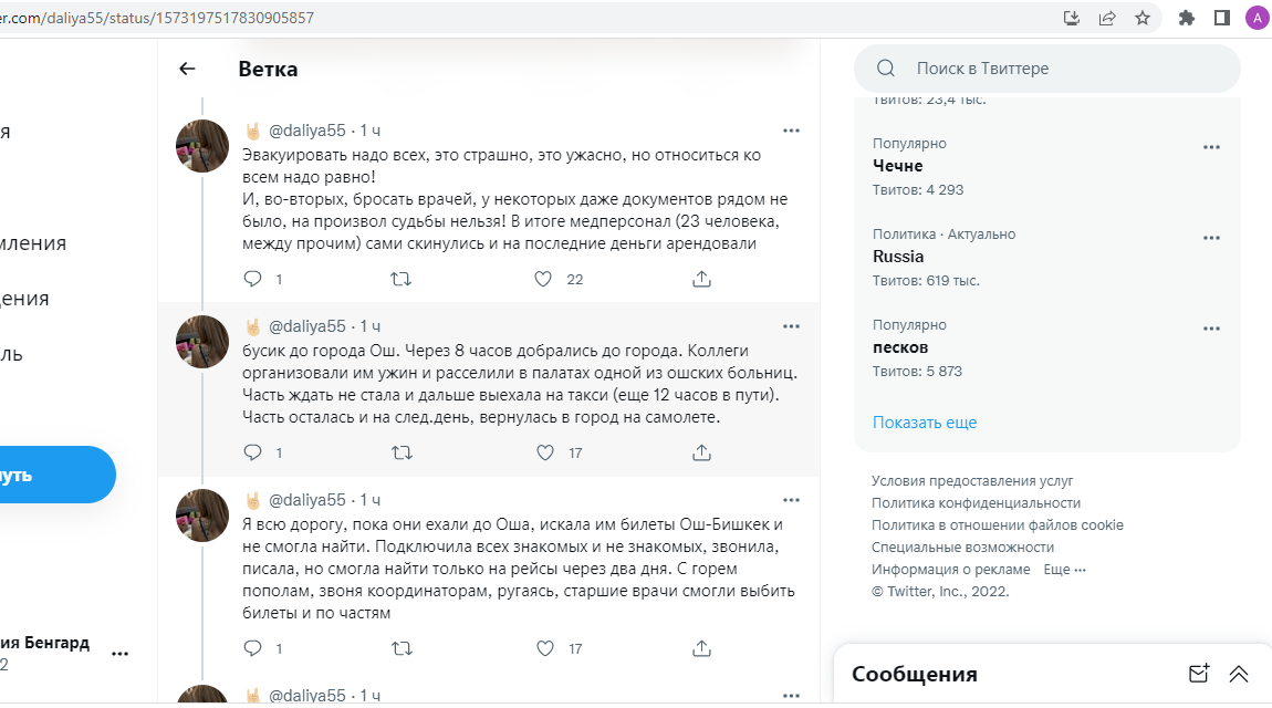 «Улетели на гражданском самолете без представителей Минздрава. Их (врачей. — Прим. 24-kg.com) привезли в город Раззаков, заселили в больницу. Они ездили на обход к эвакуированным, помогали раненым солдатам и жителям, делали сложнейшие операции в условиях районной больницы три дня и три ночи. После того как для врачей закончилась там работа, им разрешили возвращаться назад. Остались несколько специалистов на всякий случай», — написала пользовательница соцсетей.