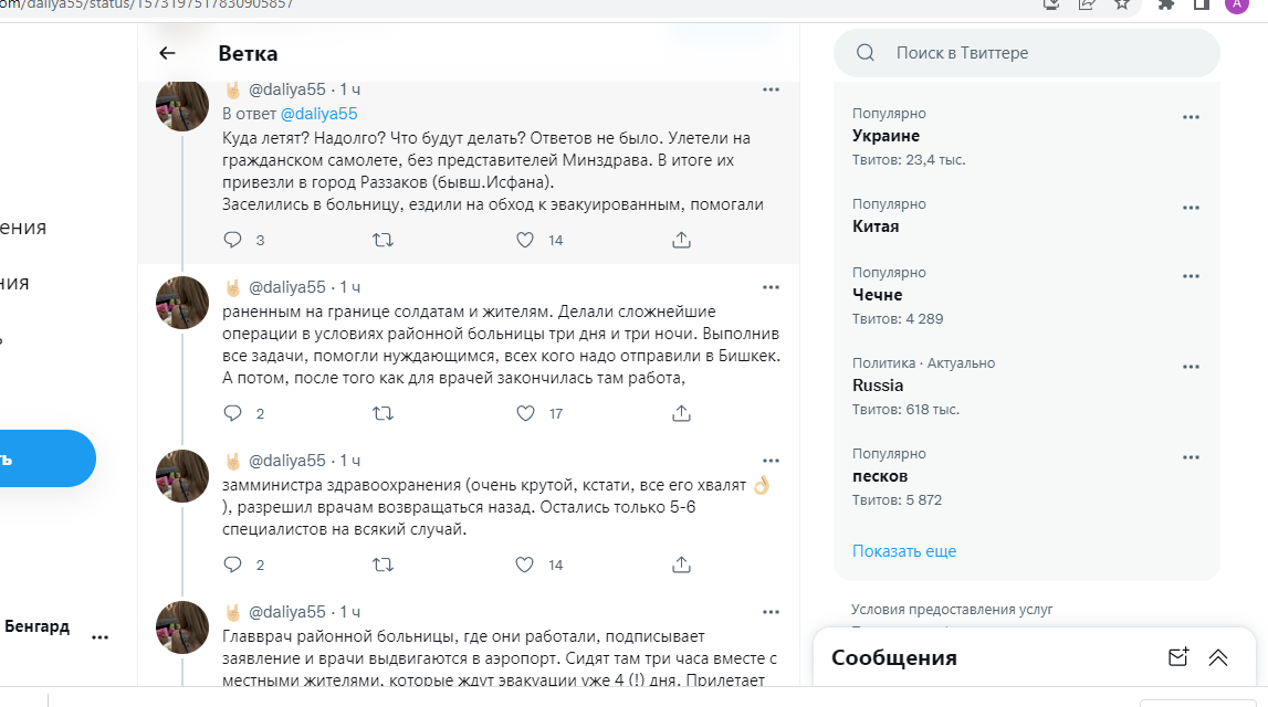 Врачам из Бишкека, командированным в Баткенскую область для оказания помощи пострадавшим в результате военной агрессии Таджикистана, пришлось самим добираться обратно. Их не обеспечили транспортом. Медики на свои деньги арендовали микроавтобус с водителем и вернулись в столицу. Об этом сообщила пользователь Twitter @daliya55.