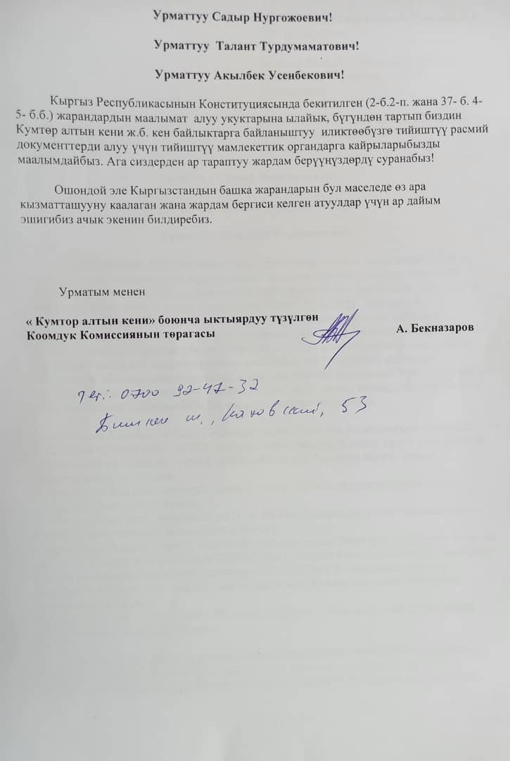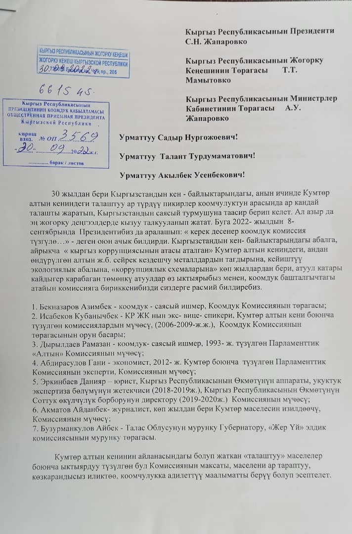«8 сентября президент сказал: «Если необходимо, создайте общественную комиссию». Официально сообщаем, что те, кто обеспокоен ситуацией в сфере недр, особенно на Кумторе, прозванном «отцом коррупции Кыргызстана», судьбой добываемого там золота и других металлов, плачевной экологической ситуацией и коррупционными схемами, на добровольной основе объединились в комиссию», — говорится в письме.
