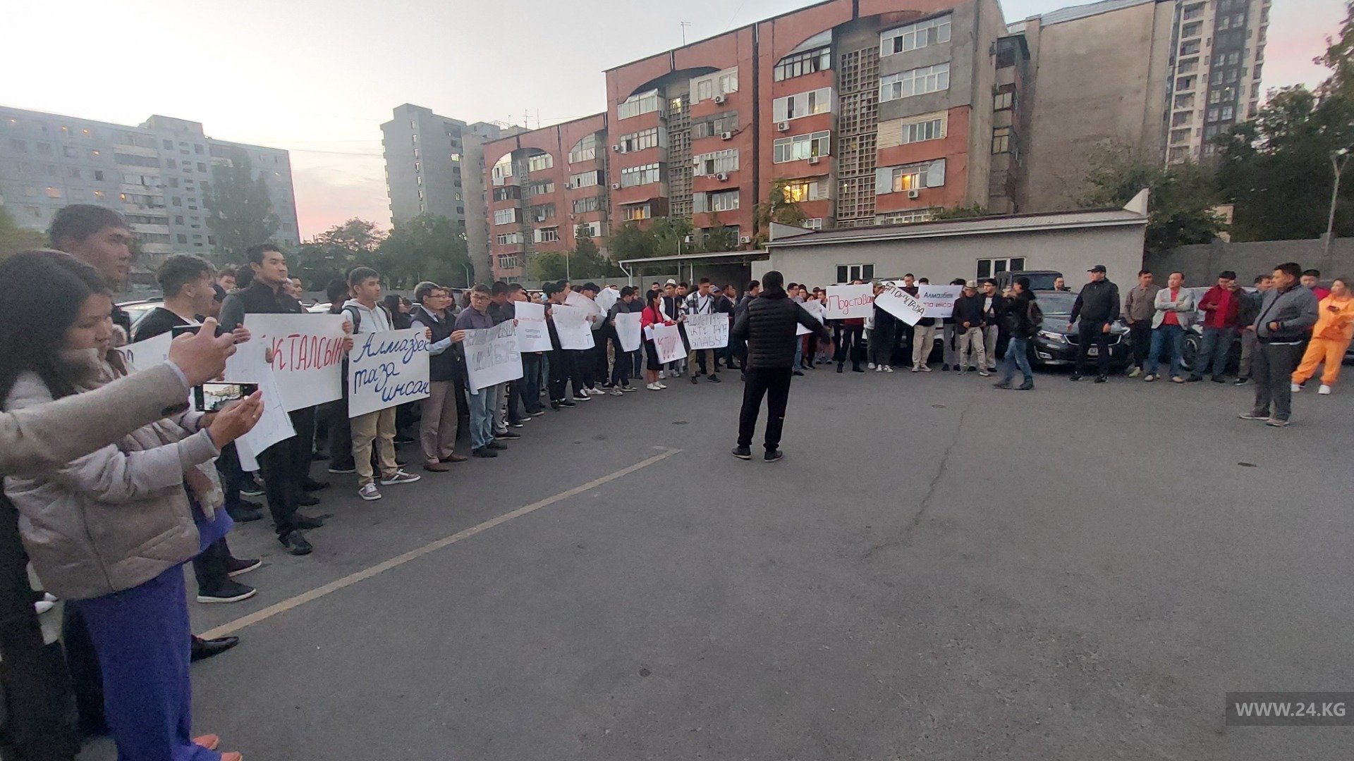 Собрались около 100 человек. В руках они держат плакаты с надписями: «Подстава», «Алмазбек — чистая личность», «Пусть оправдают».