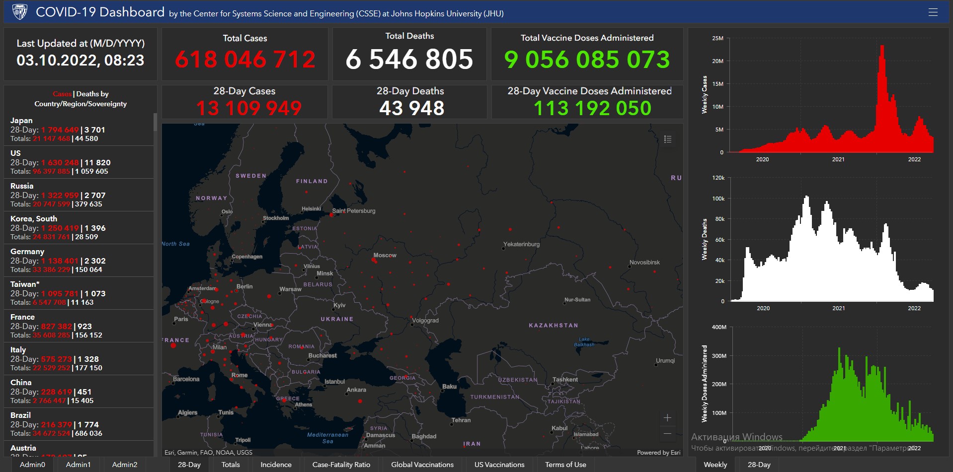 Всего в мире с начала пандемии коронавирусом заразились 618 миллионов 46 тысяч 712 человек. Больше всего в США (96 миллионов 397 тысяч 885), Индии (44 миллиона 594 тысячи 487), Бразилии (34 миллиона 672 тысячи 524), Франции (35 миллионов 608 тысяч 285), Великобритании (23 миллиона 893 тысячи 496), России (20 миллионов 747 тысяч 599), Турции (16 миллионов 873 тысячи 793), Аргентине (9 миллионов 711 тысяч 355), Иране (7 миллионов 549 тысяч 586), Колумбии (6 миллионов 307 тысяч 372), Испании (13 миллионов 422 тысячи 984), Италии (22 миллиона 529 тысяч 252) и Германии (33 миллиона 386 тысяч 229).