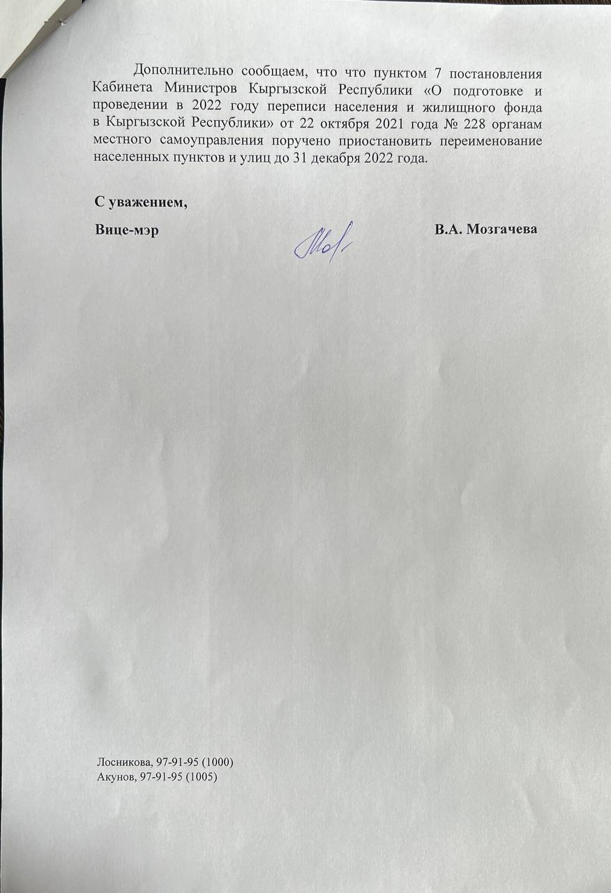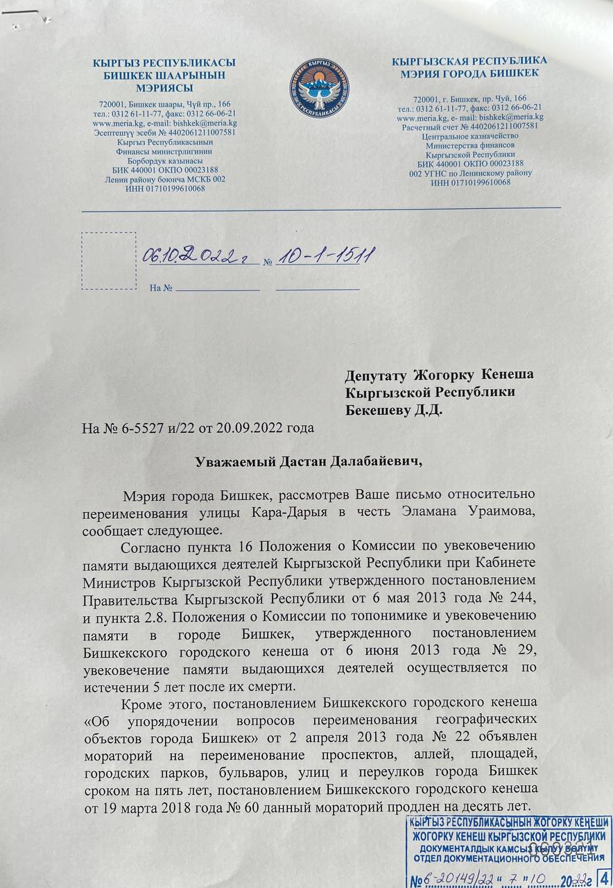 «Мэрия не соглашается переименовать улицу Кара-Дарыя, на которой находится посольство Таджикистана в Кыргызстане, ссылаясь на мораторий по переименованию улиц», — резюмировал Дастан Бекешев.