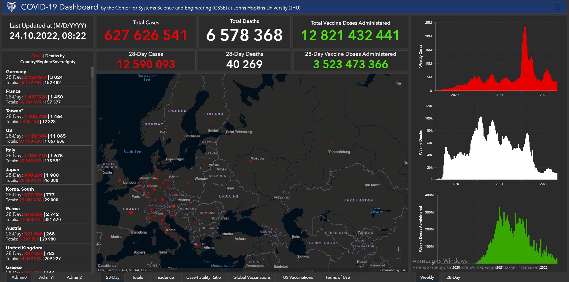 Всего в мире с начала пандемии коронавирусом заразились 627 миллионов 626 тысяч 541 человек. Больше всего в США (97 миллионов 198 тысяч 630), Индии (44 миллиона 642 тысячи 742), Бразилии (34 миллиона 780 тысяч 462), Франции (36 миллионов 741 тысяча 974), Великобритании (24 миллиона 79 тысяч 325), России (21 миллион 68 тысяч 678), Турции (16 миллионов 919 тысяч 638), Аргентине (9 миллионов 717 тысяч 546), Иране (7 миллионов 556 тысяч 97), Колумбии (6 миллионов 309 тысяч 168), Испании (13 миллионов 486 тысяч 386), Италии (23 миллиона 348 тысяч 75) и Германии (35 миллионов 172 тысячи 694).