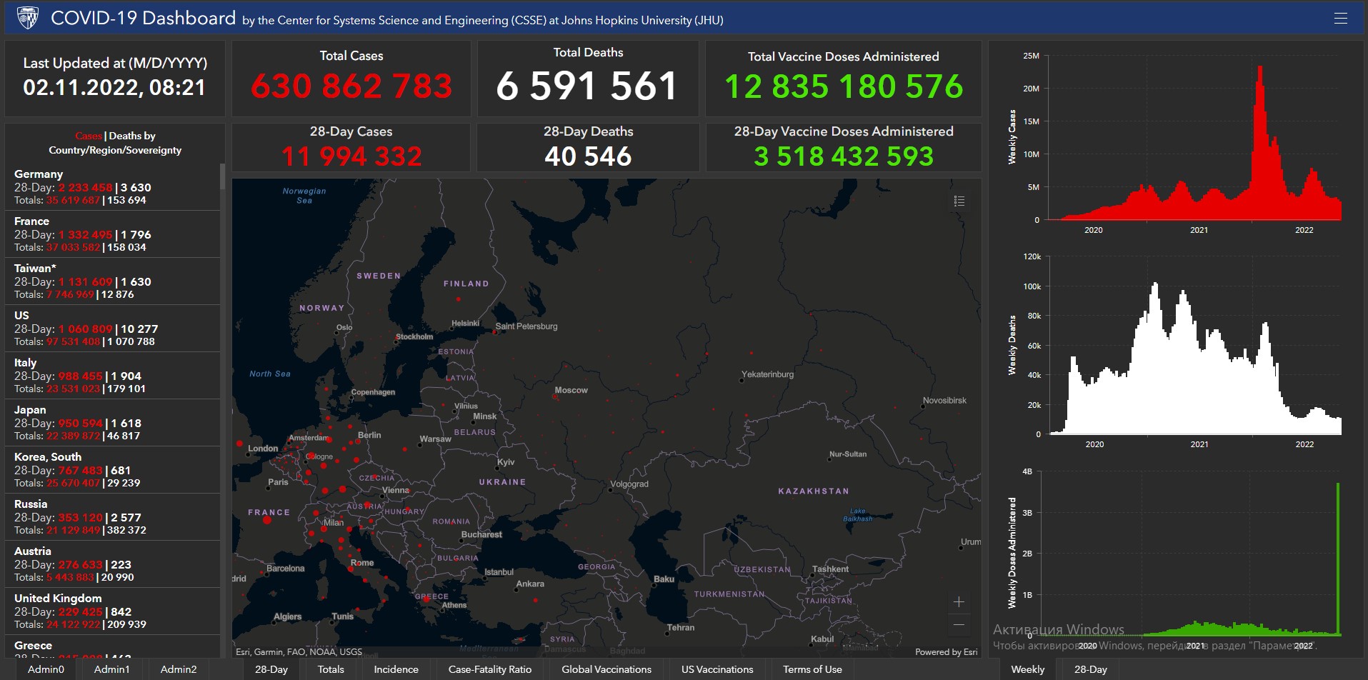 Всего в мире с начала пандемии коронавирусом заразились 630 миллионов 862 тысячи 783 человека. Больше всего в США (97 миллионов 531 тысяча 408), Индии (44 миллиона 652 тысячи 46), Бразилии (34 миллиона 837 тысяч 35), Франции (37 миллионов 33 тысячи 582), Великобритании (24 миллиона 122 тысячи 922), России (21 миллион 129 тысяч 849), Турции (16 миллионов 919 тысяч 638), Аргентине (9 миллионов 718 тысяч 875), Иране (7 миллионов 557 тысяч 805), Колумбии (6 миллионов 309 тысяч 716), Испании (13 миллионов 511 тысяч 768), Италии (23 миллиона 531 тысяча 23) и Германии (35 миллионов 619 тысяч 687).