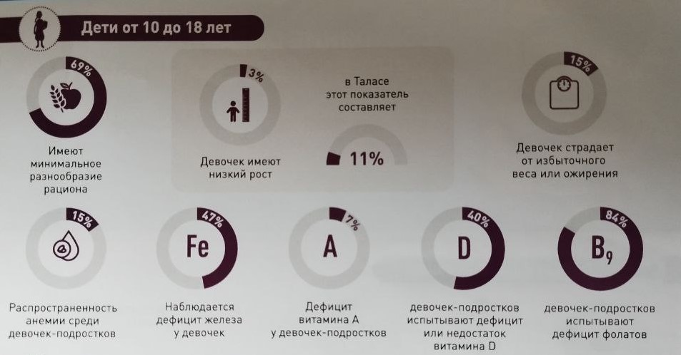 У взрослых проблем не меньше. Почти половина беременных в Кыргызстане страдает анемией, что повышает риск материнской и неонатальной смертности, преждевременных родов и задержки развития ребенка.Подавляющее большинство женщин и девочек-подростков — 86 процентов — страдают дефицитом фолиевой кислоты.
