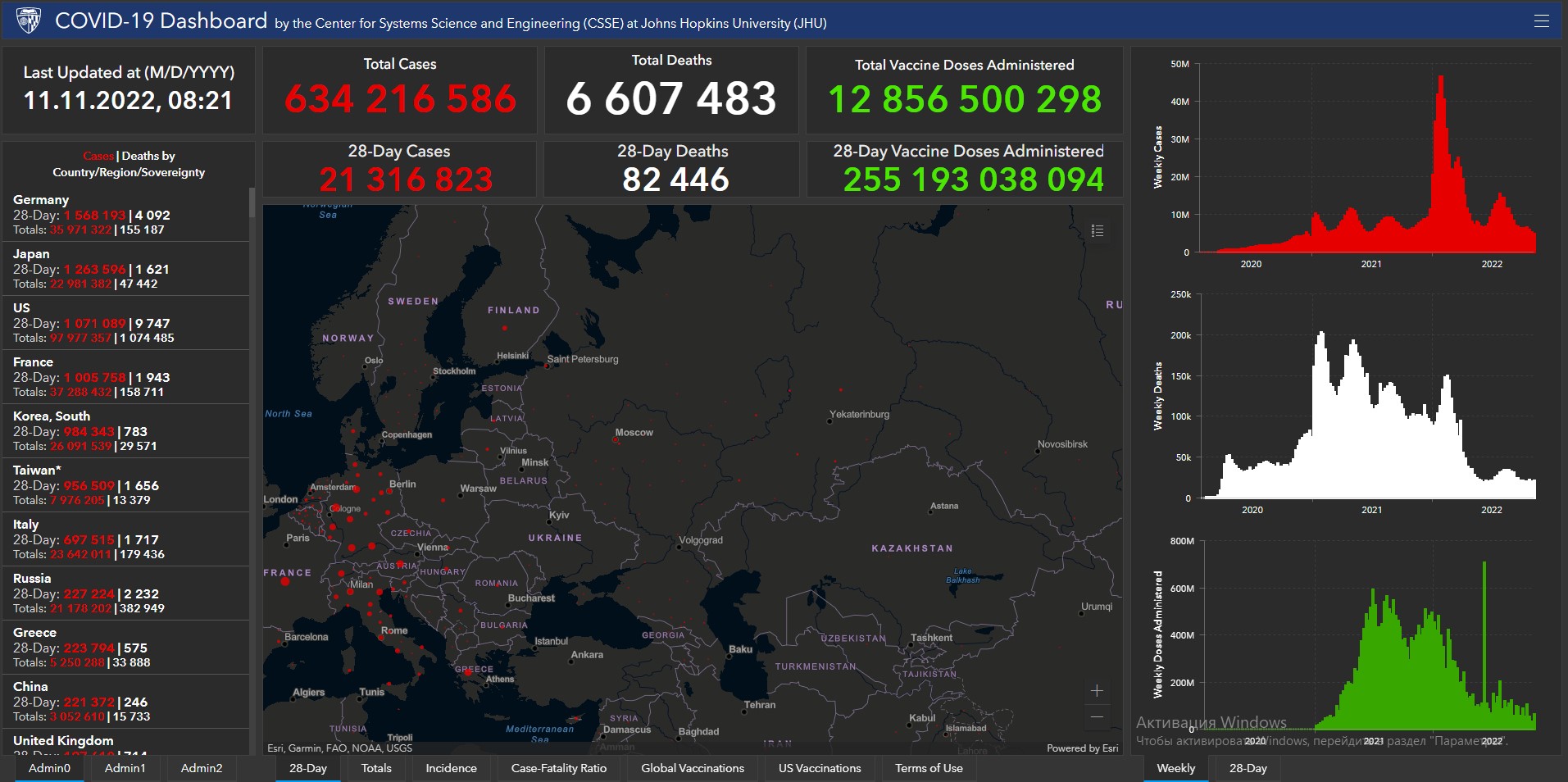 Всего в мире с начала пандемии коронавирусом заразились 634 миллиона 216 тысяч 586 человек. Больше всего в США (97 миллионов 977 тысяч 357), Индии (44 миллиона 662 тысячи 745), Бразилии (34 миллиона 889 тысяч 576), Франции (37 миллионов 288 тысяч 432), Великобритании (24 миллиона 179 тысяч 611), России (21 миллион 178 тысяч 202), Турции (16 миллионов 919 тысяч 638), Аргентине (9 миллионов 720 тысяч 232), Иране (7 миллионов 558 тысяч 762), Колумбии (6 миллионов 311 тысяч 359), Испании (13 миллионов 529 тысяч 643), Италии (23 миллиона 642 тысячи 11) и Германии (35 миллионов 971 тысяча 322).