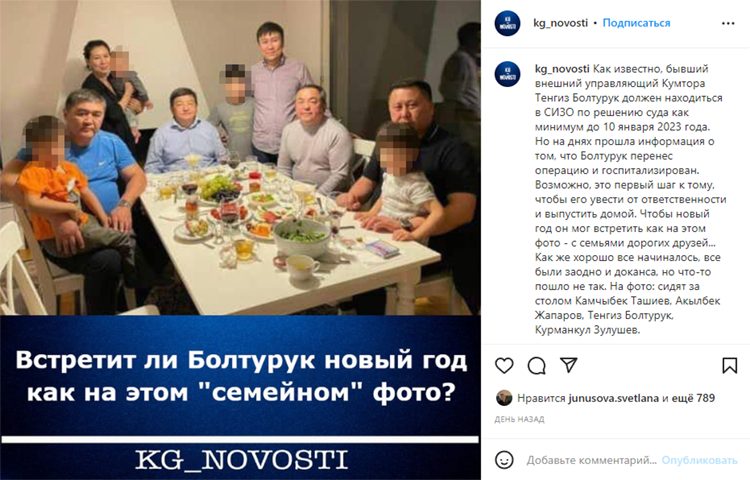 «Но на днях прошла информация о том, что Болтурук перенес операцию и госпитализирован. Возможно, это первый шаг к тому, чтобы его увести от ответственности и выпустить домой. Чтобы новый год он мог встретить, как на этом фото — с семьями дорогих друзей... Как же хорошо все начиналось, все были заодно и доканса, но что-то пошло не так. На фото: сидят за столом Камчыбек Ташиев, Акылбек Жапаров, Тенгиз Болтурук, Курманкул Зулушев», — пишет издание.
