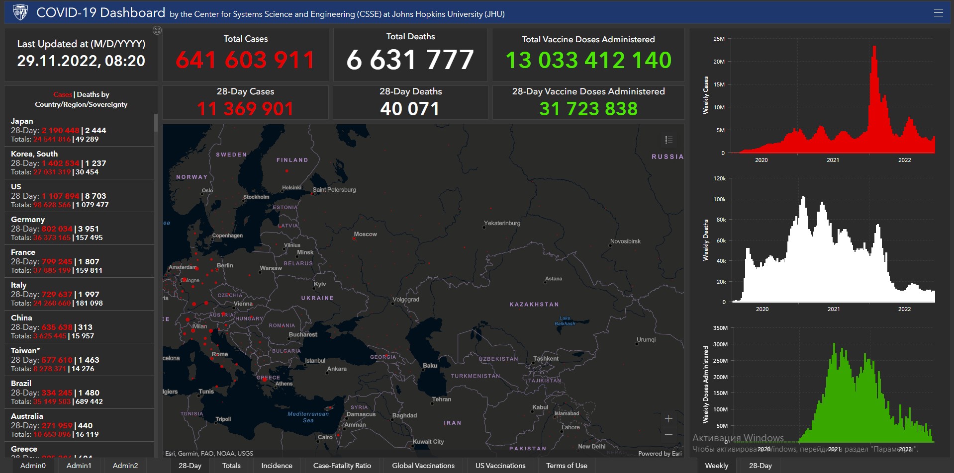 Всего в мире с начала пандемии коронавирусом заразились 641 миллион 603 тысячи 911 человек. Больше всего в США (98 миллионов 628 тысяч 566), Индии (44 миллиона 673 тысячи 78), Бразилии (35 миллионов 149 тысяч 503), Франции (37 миллионов 885 тысяч 199), Великобритании (24 миллиона 224 тысячи 763), России (21 миллион 273 тысячи 541), Турции (16 миллионов 919 тысяч 638), Аргентине (9 миллионов 727 тысяч 247), Иране (7 миллионов 559 тысяч 634), Колумбии (6 миллионов 312 тысяч 657), Испании (13 миллионов 595 тысяч 504), Италии (24 миллиона 260 тысяч 660) и Германии (36 миллионов 373 тысячи 165).