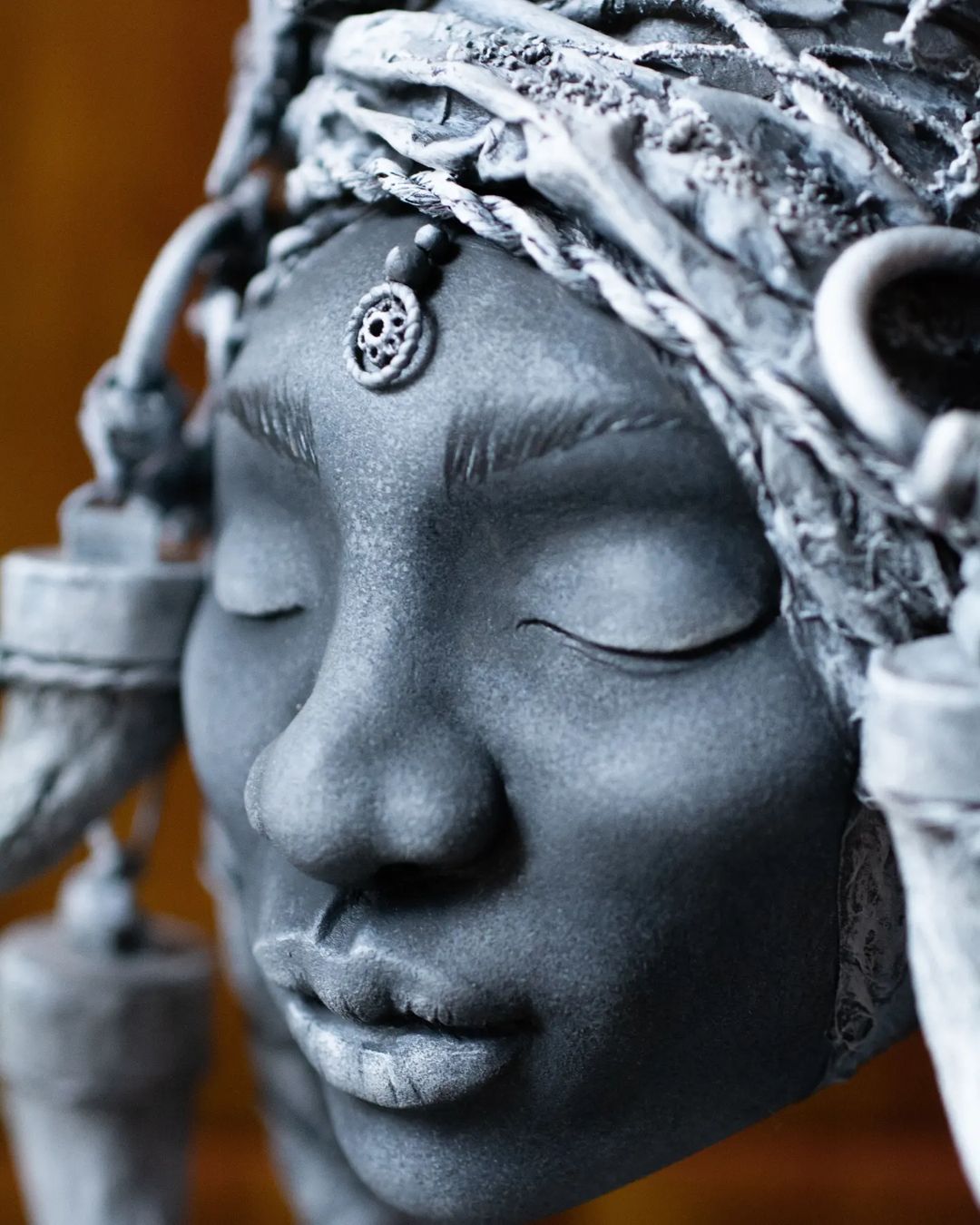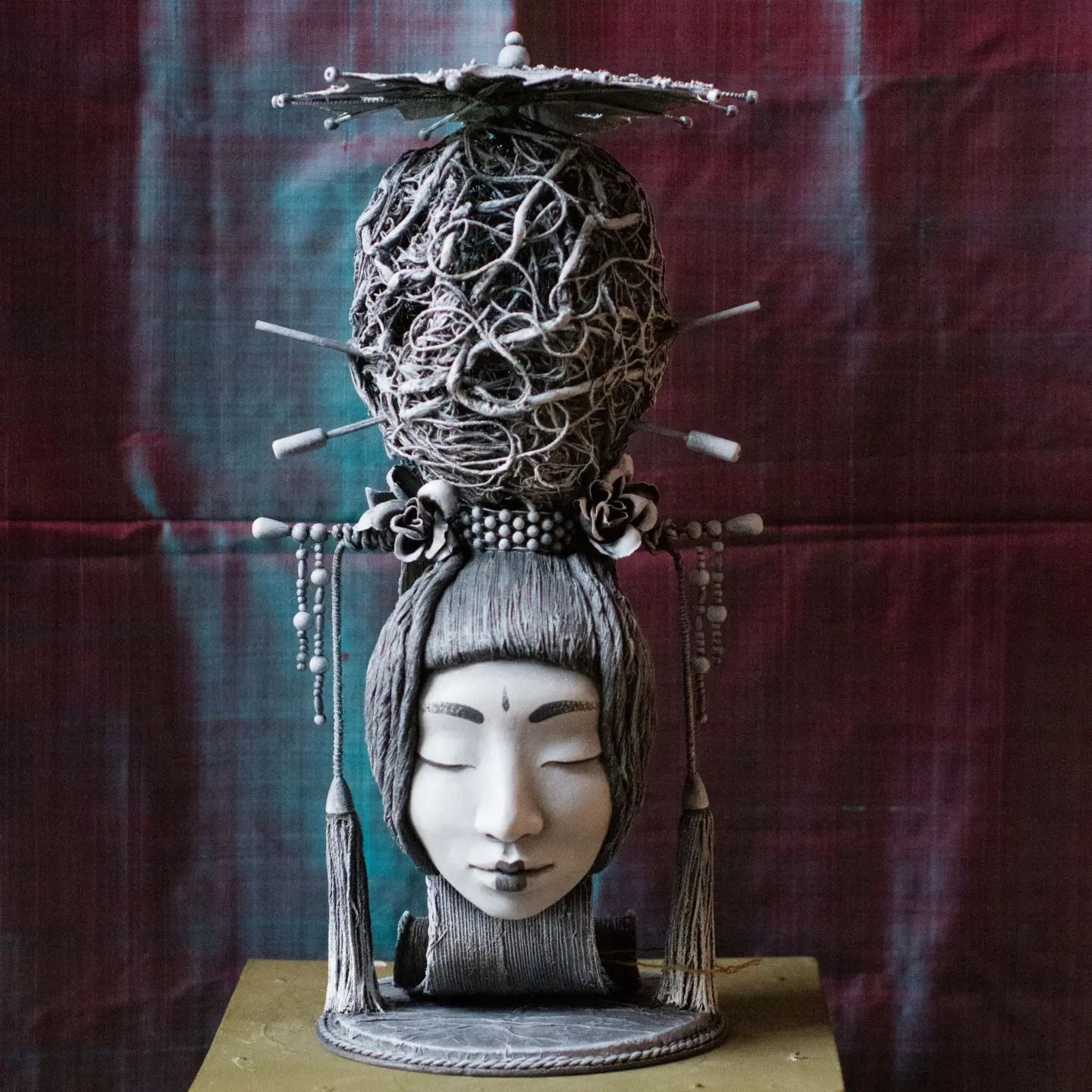 Так на выставке можно увидеть «Думы» — одну из новых работ известного мастера Натальи Копыловой. Собирательные образы Азии, Африки Японии выполнены из папье-маше и специального пластика.