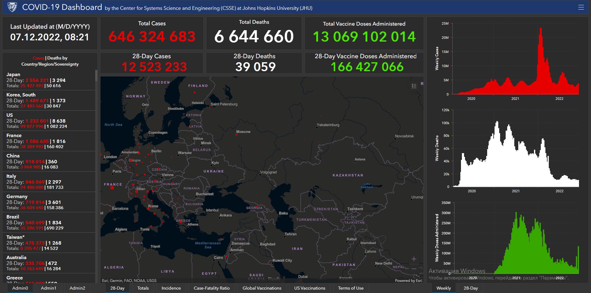 Всего в мире с начала пандемии коронавирусом заразились 646 миллионов 34 тысячи 683 человека. Больше всего в США (99 миллионов 77 тысяч 996), Индии (44 миллиона 673 тысячи 783), Бразилии (35 миллионов 396 тысяч 191), Франции (38 миллионов 384 тысячи 992), Великобритании (24 миллиона 252 тысячи 17), России (21 миллион 322 тысячи 168), Турции (16 миллионов 919 тысяч 638), Аргентине (9 миллионов 739 тысяч 856), Иране (7 миллионов 559 тысяч 958), Колумбии (6 миллионов 314 тысяч 107), Испании (13 миллионов 614 тысяч 807), Италии (24 миллиона 488 тысяч 80) и Германии (36 миллионов 604 тысячи 648).