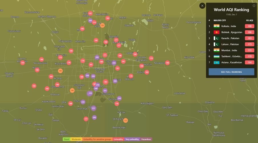 В 18.00 статус города отмечен как «нездоровый». Индекс качества воздуха, по данным сайта, составляет 186 (AQI).