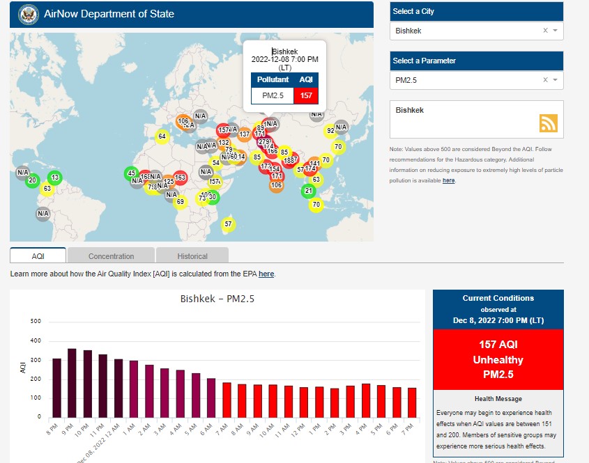 Посольство США в Кыргызстане также установило станцию. Информация обновляется каждый час. Индекс качества воздуха в районе дипломатической миссии «нездоровый» — 157 (AQI).