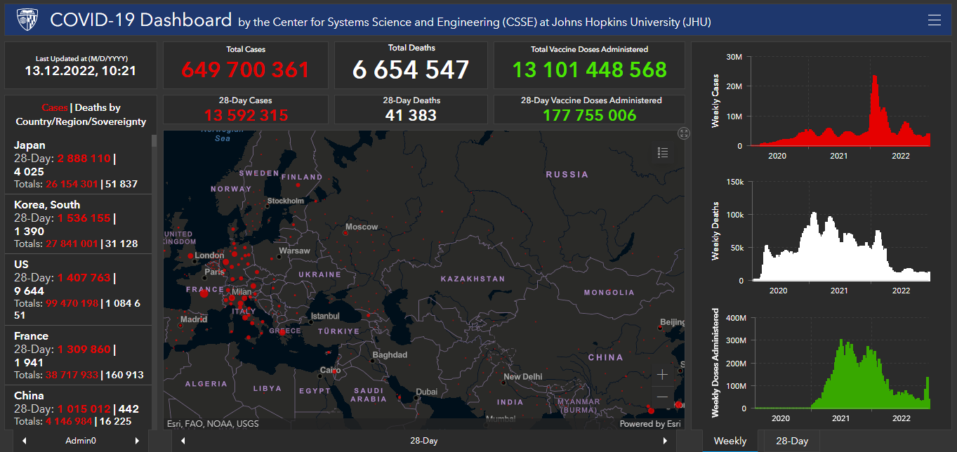 Всего в мире с начала пандемии коронавирусом заразились 649 миллионов 700 тысяч 361 человек. Больше всего в США (99 миллионов 470 тысяч 198), Индии (44 миллиона 676 тысяч 45), Бразилии (35 миллионов 643 тысячи 770), Франции (38 миллионов 717 тысяч 933), Великобритании (24 миллиона 281 тысяча 498), России (21 миллион 364 тысячи 571), Турции (16 миллионов 919 тысяч 638), Аргентине (9 миллионов 766 тысяч 975), Иране (7 миллионов 560 тысяч 217), Колумбии (6 миллионов 317 тысяч 10), Испании (13 миллионов 632 тысячи 635), Италии (24 миллиона 709 тысяч 404) и Германии (36 миллионов 812 тысяч 671).Количество смертей от коронавируса достигло 6 миллионов 654 тысяч 547. За сутки показатель вырос на 1 тысячу 780 человек. В том числе в США всего с начала пандемии скончались 1 миллион 84 тысячи 651 человек, Бразилии — 691 тысяча 15, Индии — 530 тысяч 658, Мексике — 330 тысяч 701, России — 384 тысячи 749, Великобритании — 213 тысяч 508, Италии — 182 тысячи 419.