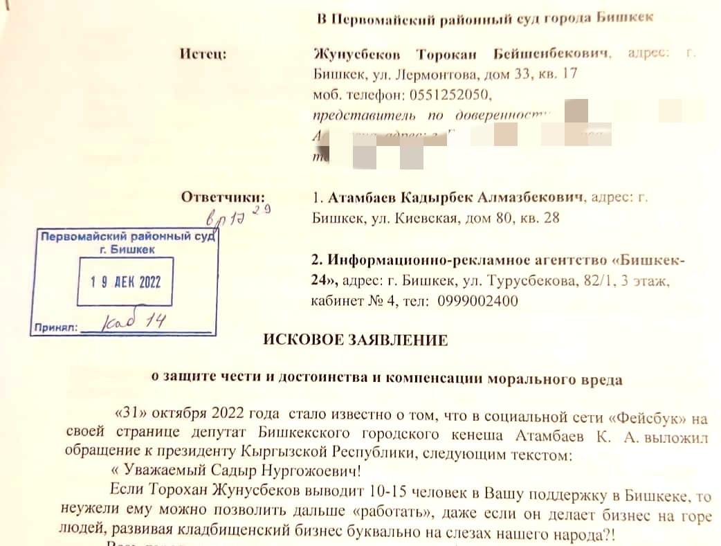 Директор муниципального предприятия «Бишкекское агентство ритуальных услуг» (БАРУ) Торохан Жунусбеков подал в суд на депутата городского кенеша Кадырбека Атамбаева и журналистов. Об этом он сообщил в соцсетях.