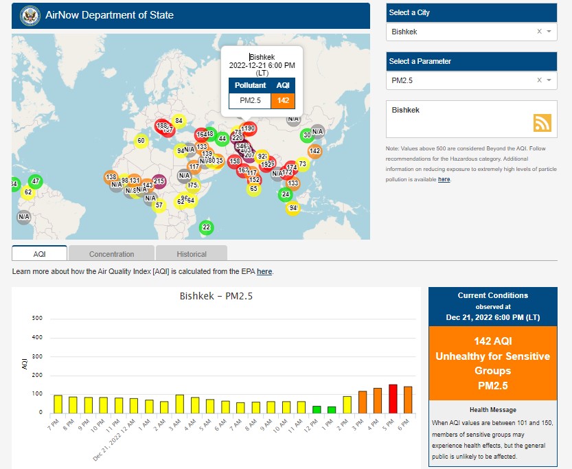 Посольство США в Кыргызстане также установило станцию. Информация обновляется каждый час. Индекс качества воздуха в районе дипломатической миссии «нездоровый для чувствительных групп» — 142 (AQI).
