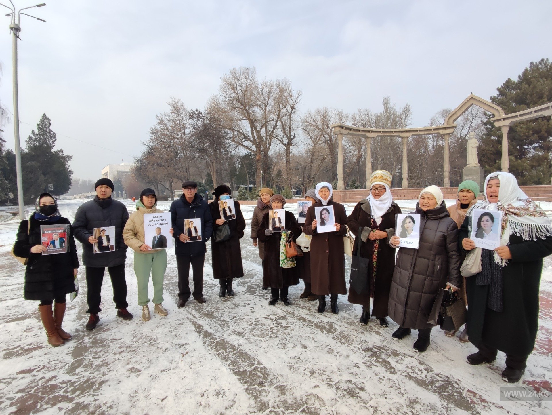 В Бишкеке на акцию протеста вновь вышли родственники задержанных по делу о попытке насильственного захвата власти. Люди, преимущественно старшего поколения, собрались у памятника Курманджан датке.