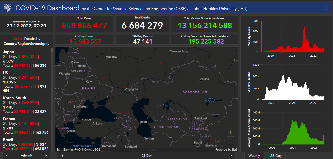 Всего в мире с начала пандемии коронавирусом заразились 658 миллионов 866 тысяч 477 человек. Больше всего в США (100 миллионов 579 тысяч 771), Индии (44 миллиона 677 тысяч 647), Бразилии (36 миллионов 264 тысячи 721), Франции (39 миллионов 449 тысяч 665), Великобритании (24 миллиона 365 тысяч 688), России (21 миллион 473 тысячи 189), Турции (16 миллионов 919 тысяч 638), Аргентине (9 миллионов 891 тысяча 139), Иране (7 миллионов 560 тысяч 947), Колумбии (6 миллионов 328 тысяч 989), Испании (13 миллионов 670 тысяч 37), Италии (25 миллионов 21 тысяча 606) и Германии (37 миллионов 272 тысячи 430).Количество смертей от коронавируса достигло 6 миллионов 684 тысяч 279. За сутки показатель вырос на 2 тысячи 313 человек. В том числе в США всего с начала пандемии скончались 1 миллион 91 тысяча 454 человека, Бразилии — 693 тысячи 562, Индии — 530 тысяч 696, Мексике — 331 тысяча 71, России — 385 тысяч 626, Великобритании — 213 тысяч 997, Италии — 183 тысячи 936.