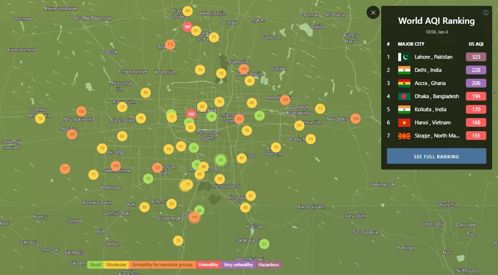 В рейтинге крупнейших городов мира по качеству воздуха World Air Quality Бишкек находится на 48-м месте.