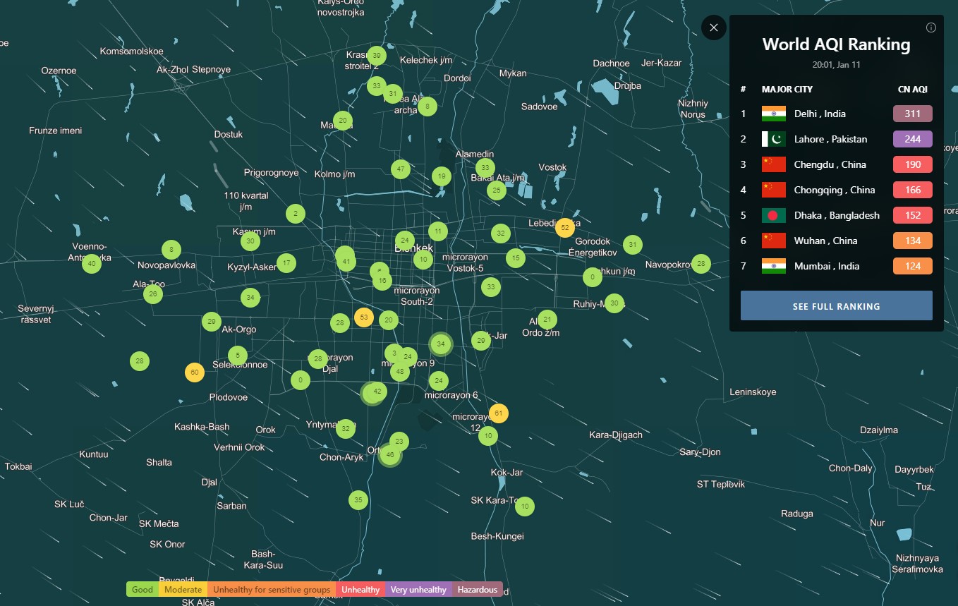 В рейтинге крупнейших городов мира по качеству воздуха World Air Quality Бишкек находится на 53-м месте.