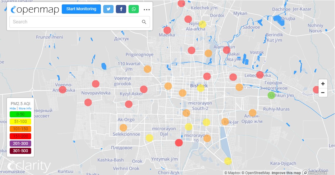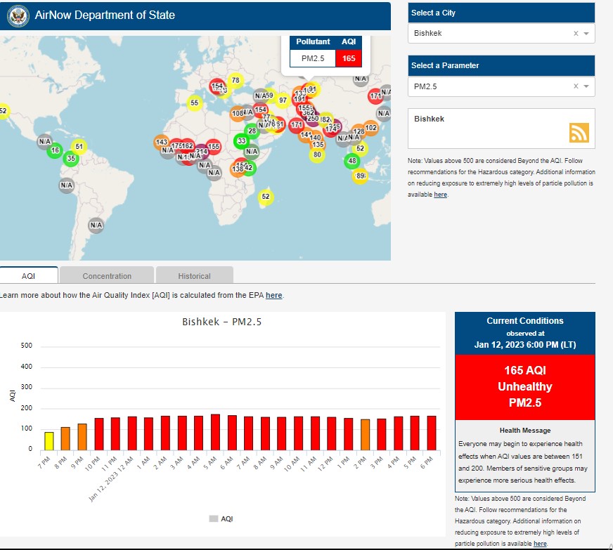 Посольство США в Кыргызстане также установило станцию. Информация обновляется каждый час. Индекс качества воздуха в районе дипломатической миссии «нездоровый» — 165 (AQI).Узнать качество воздуха можно и на сайте Гидрометеорологической службы. Информация обновляется ежечасно.