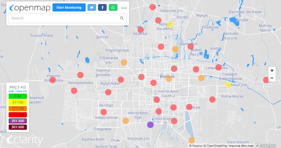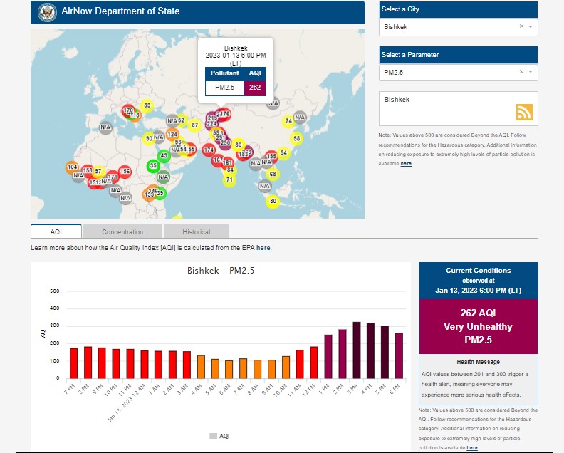 Посольство США в Кыргызстане также установило станцию. Информация обновляется каждый час. Индекс качества воздуха в районе дипломатической миссии «очень нездоровый» — 262 (AQI).