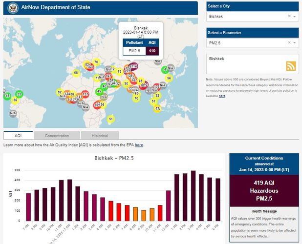 Посольство США в Кыргызстане также установило станцию. Информация обновляется каждый час. Индекс качества воздуха в районе дипломатической миссии «опасный» — 419 (AQI).