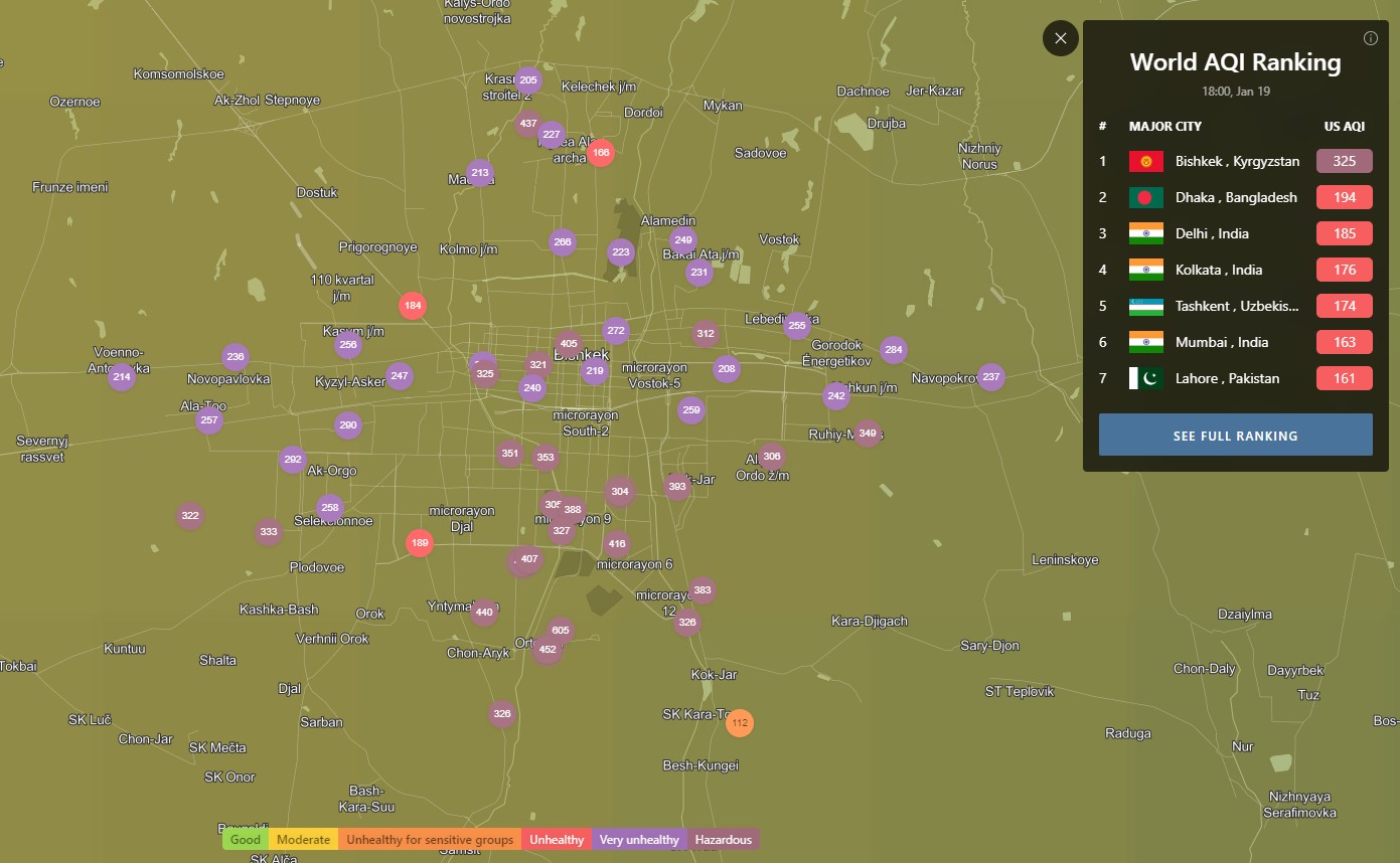 В 18.00 статус города отмечен как «очень нездоровый». Индекс качества воздуха, по данным сайта, составляет 325 (AQI).