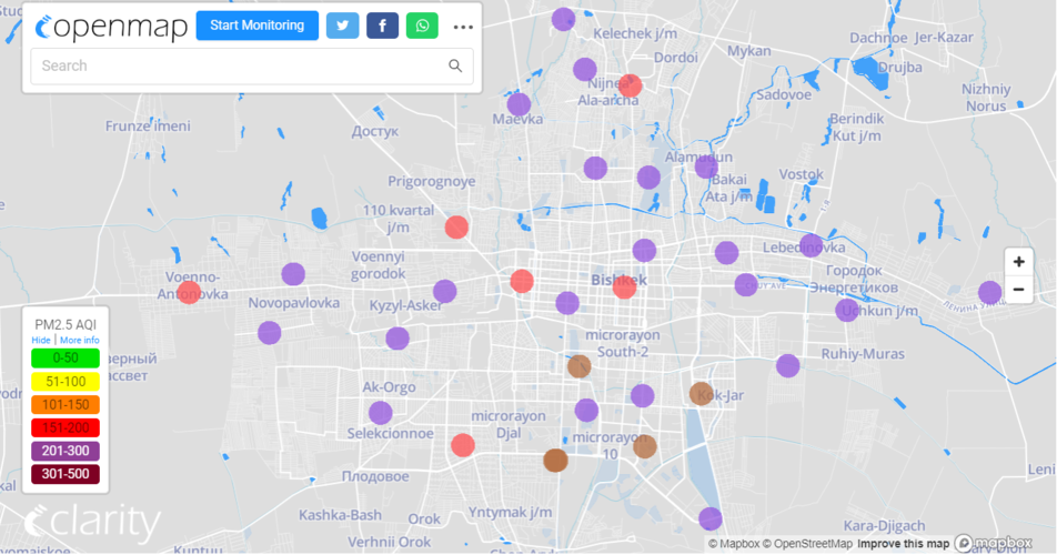 Посольство США в Кыргызстане также установило станцию. Информация обновляется каждый час. Индекс качества воздуха в районе дипломатической миссии «опасный» — 462 (AQI).