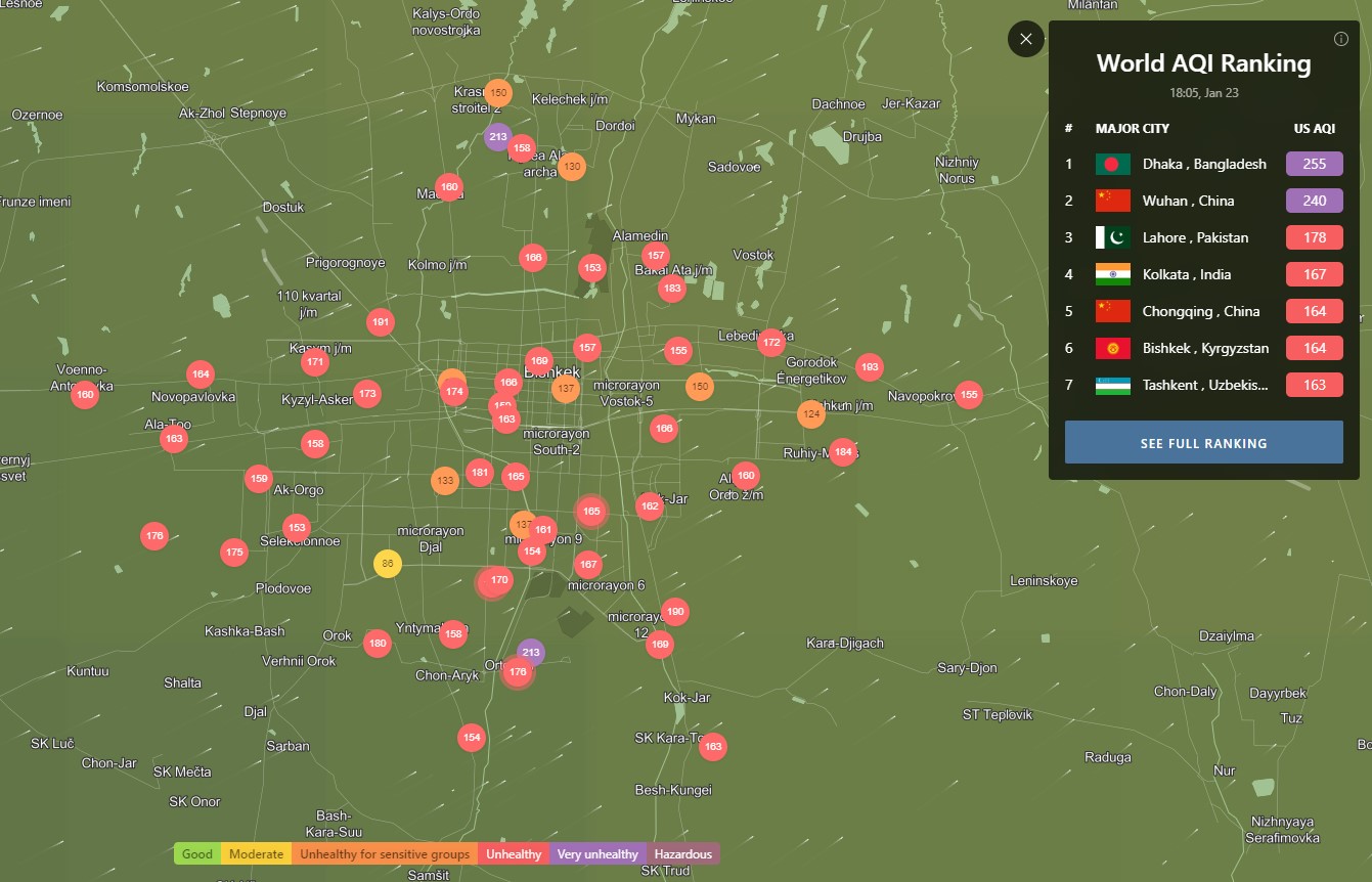 В рейтинге крупнейших городов мира по качеству воздуха World Air Quality Бишкек опустился на шестое место.