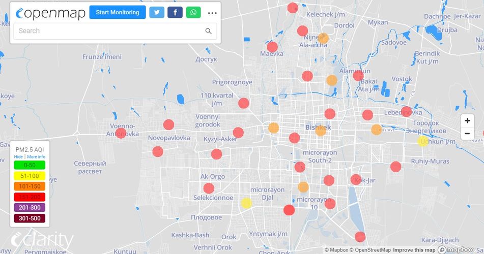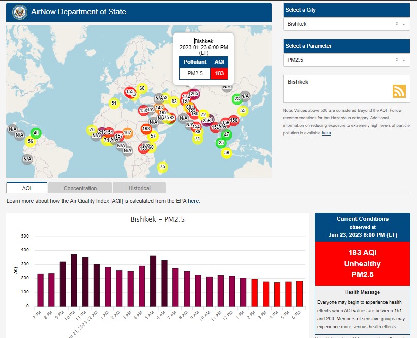 Посольство США в Кыргызстане также установило станцию. Информация обновляется каждый час. Индекс качества воздуха в районе дипломатической миссии «нездоровый» — 183 (AQI).