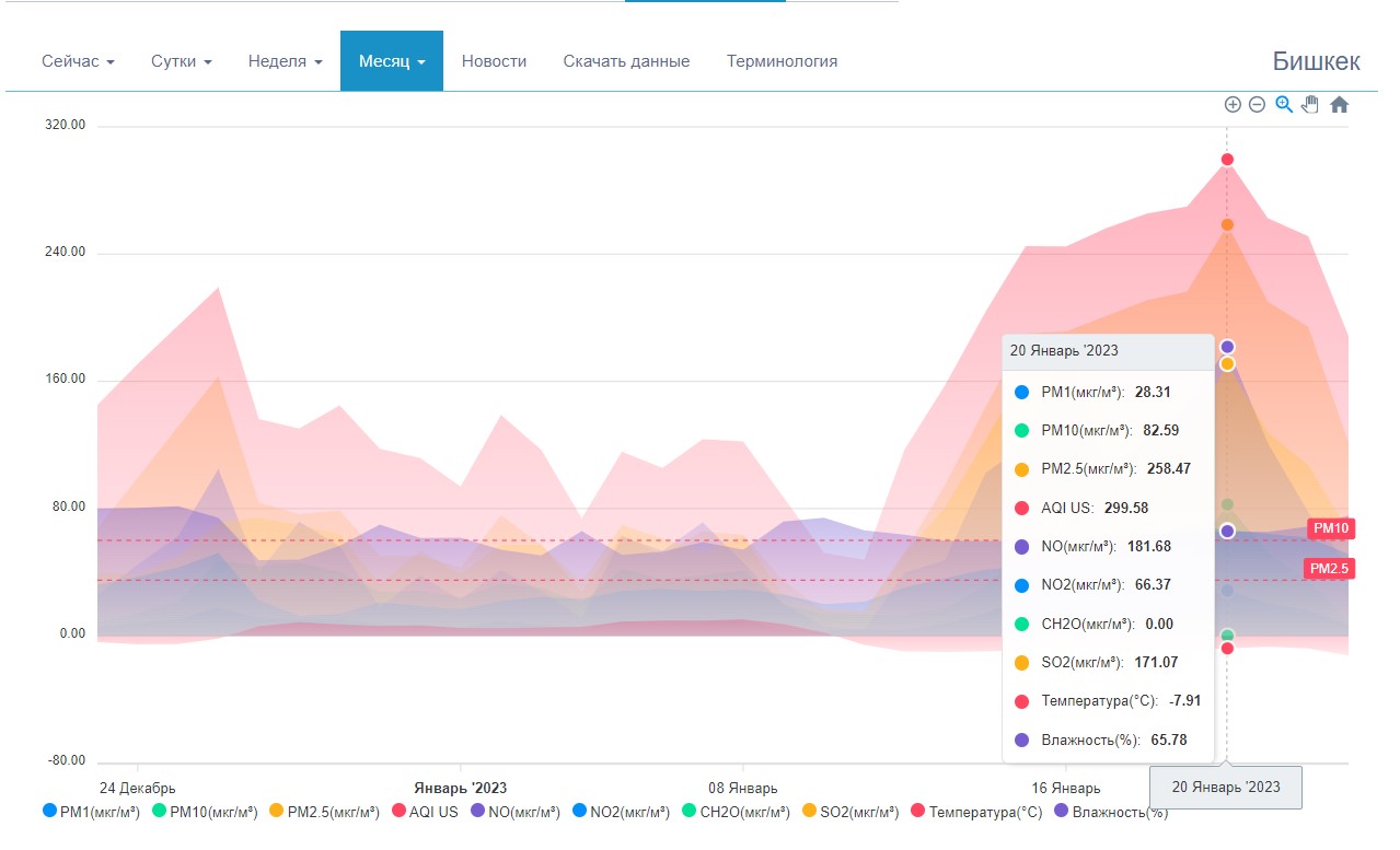Отметим, что, по данным Гидрометеорологической службы, 20 января зарегистрирован самый высокий уровень загрязнения воздуха за месяц — 299,58 AQI.