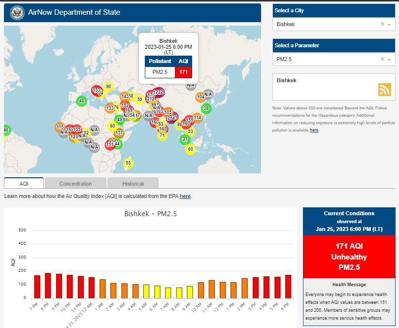 Посольство США в Кыргызстане также установило станцию. Информация обновляется каждый час. Индекс качества воздуха в районе дипломатической миссии «нездоровый» — 171 (AQI).