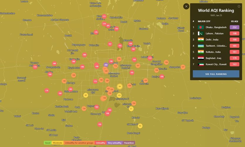 В 18.00 статус города отмечен как «нездоровый для чувствительных групп». Индекс качества воздуха, по данным сайта, составляет 148 (AQI).
