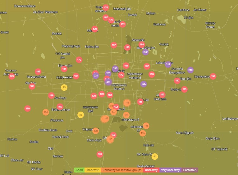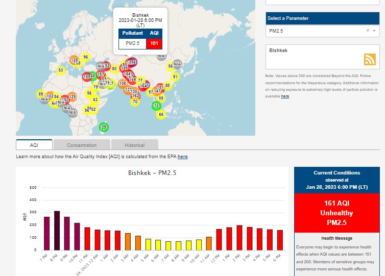 Посольство США в Кыргызстане также установило станцию. Информация обновляется каждый час. Индекс качества воздуха в районе дипломатической миссии «нездоровый» — 161 (AQI).