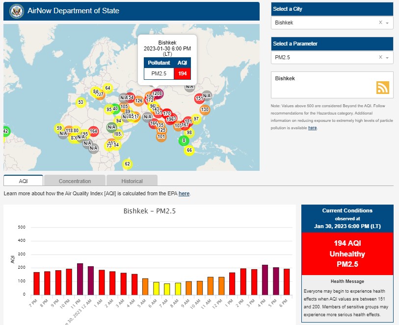 Посольство США в Кыргызстане также установило станцию. Информация обновляется каждый час. Индекс качества воздуха в районе дипломатической миссии «нездоровый» — 194 (AQI).