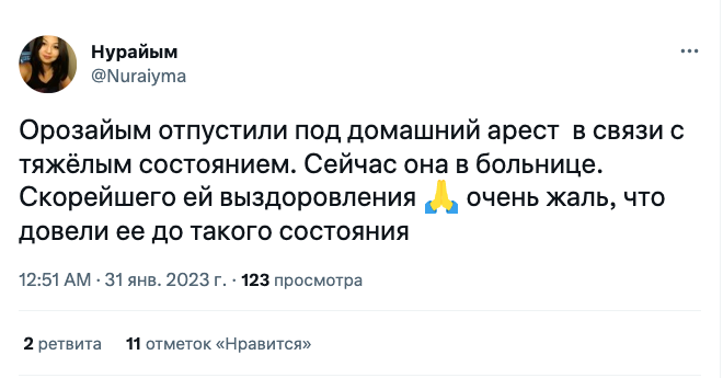 «Орозайым отпустили под домашний арест в связи с тяжелым состоянием. Сейчас она в больнице», — написала Нурайым Сыдыгалиева.