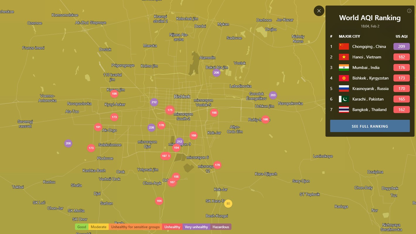Посольство США в Кыргызстане также установило станцию. Информация обновляется каждый час. Индекс качества воздуха в районе дипломатической миссии «нездоровый» — 176 (AQI).