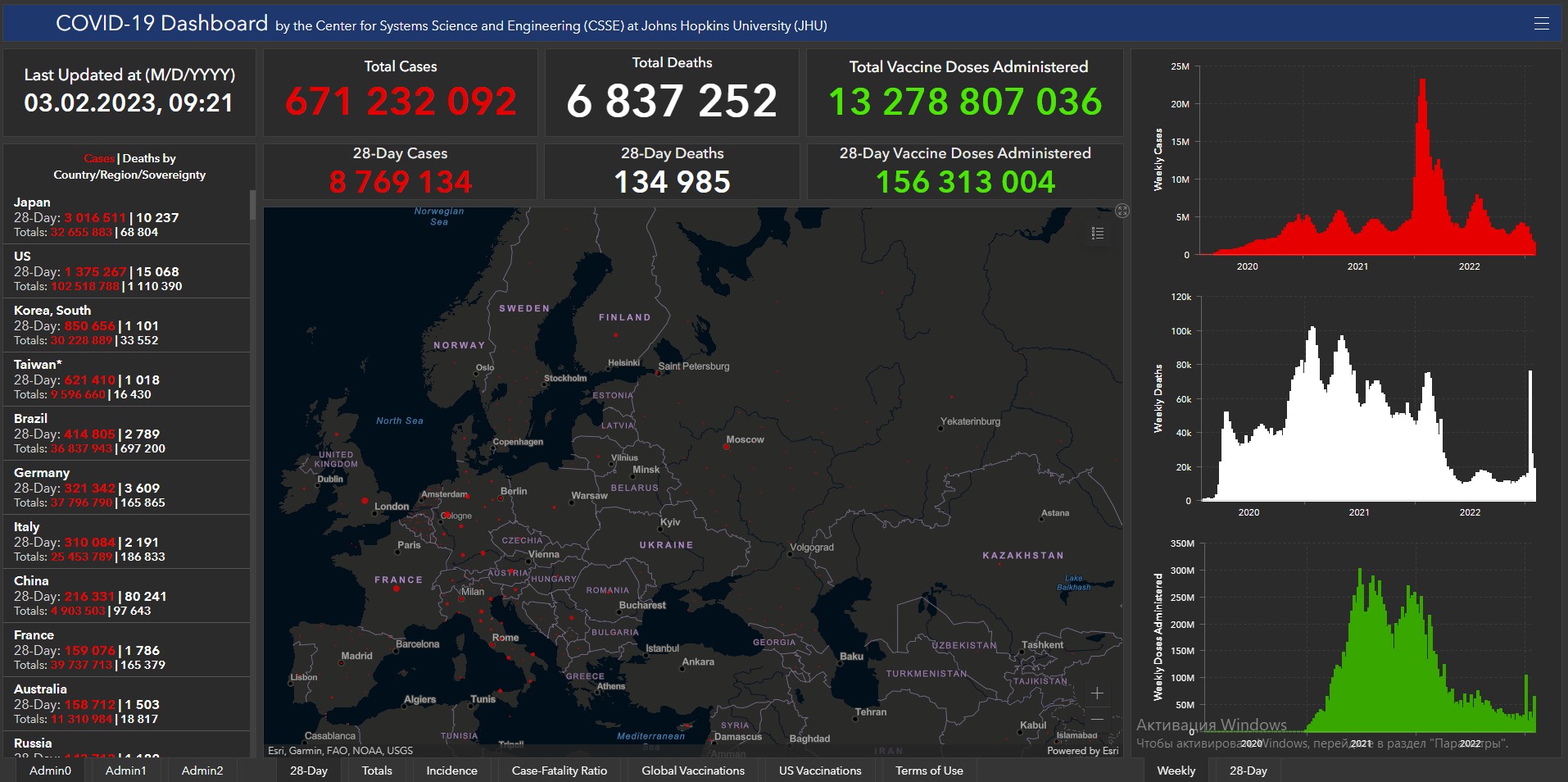 Всего в мире с начала пандемии коронавирусом заразились 671 миллион 232 тысячи 92 человека. Больше всего в США (102 миллиона 518 тысяч 788), Индии (44 миллиона 683 тысячи 23), Бразилии (36 миллионов 837 тысяч 943), Франции (39 миллионов 737 тысяч 713), Великобритании (24 миллиона 526 тысяч 807), России (21 миллион 658 тысяч 642), Турции (17 миллионов 42 тысячи 722), Аргентине (10 миллионов 37 тысяч 135), Иране (7 миллионов 564 тысячи 551), Колумбии (6 миллионов 355 тысяч 135), Испании (13 миллионов 731 тысяча 478), Италии (25 миллионов 453 тысячи 789) и Германии (37 миллионов 796 тысяч 790).Количество смертей от коронавируса достигло 6 миллионов 837 тысяч 252. За сутки показатель вырос на 1 тысячу 981 человека. В том числе в США всего с начала пандемии скончались 1 миллион 110 тысяч 390 человек, Бразилии — 697 тысяч 200, Индии — 530 тысяч 741, Мексике — 332 тысячи 324, России — 387 тысяч 193, Великобритании — 217 тысяч 654, Италии — 186 тысяч 833.