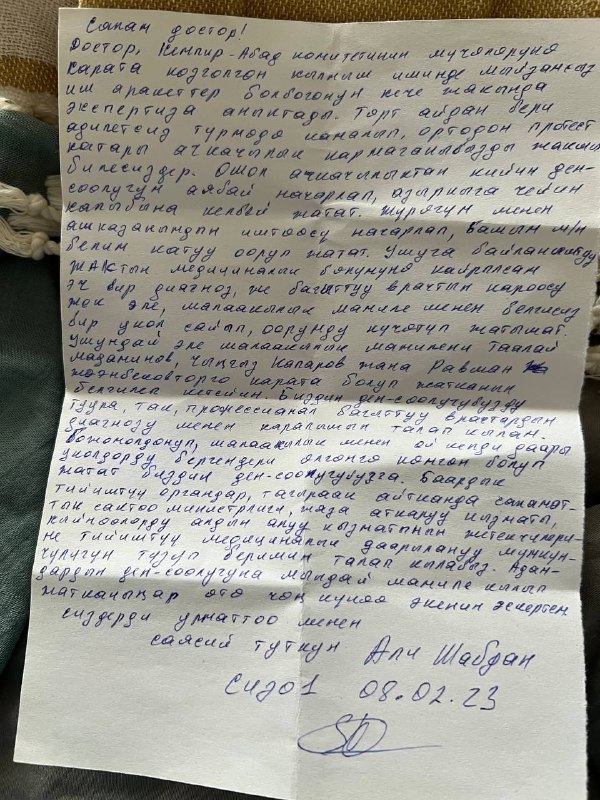 «Уже четыре месяца несправедливо находимся под стражей, и за это время вы знаете, что в качестве протеста проводили голодовку. После акции сильно пострадало здоровье, я и до сих пор не могу восстановиться. Ухудшилась работа сердца и желудка, болит спина и голова. В связи с этим обратился к врачам учреждения, однако они, не поставив какой-либо диагноз, без назначения, халатно колят мне неизвестные уколы. От этого мне становится только хуже. Такое же отношение к Таалаю Мадаминову, Чынгызу Капарову и Равшану Джеенбекову. Требую, чтобы нас осмотрели специализированные медики», — написал Али Шабдан.