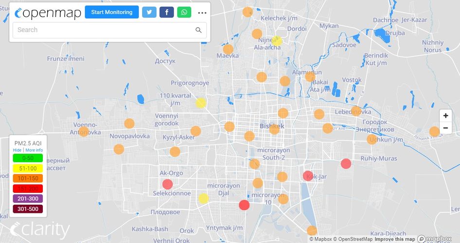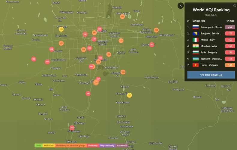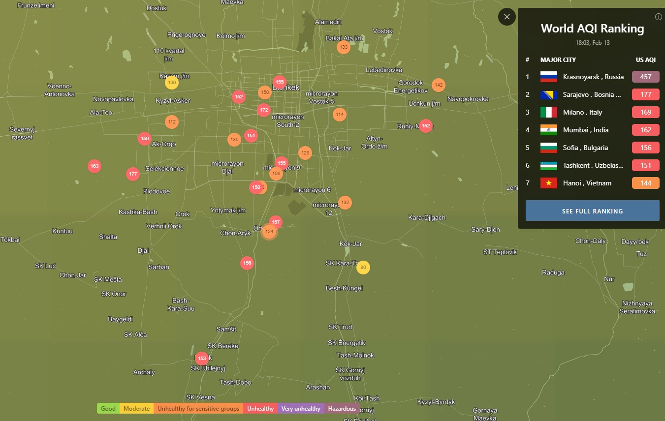 Посольство США в Кыргызстане также установило станцию. Информация обновляется каждый час. Индекс качества воздуха в районе дипломатической миссии «нездоровый» — 166 (AQI).