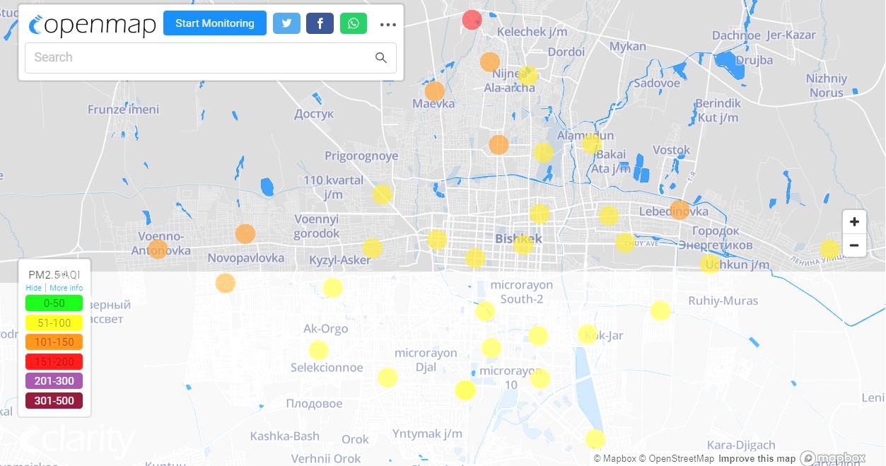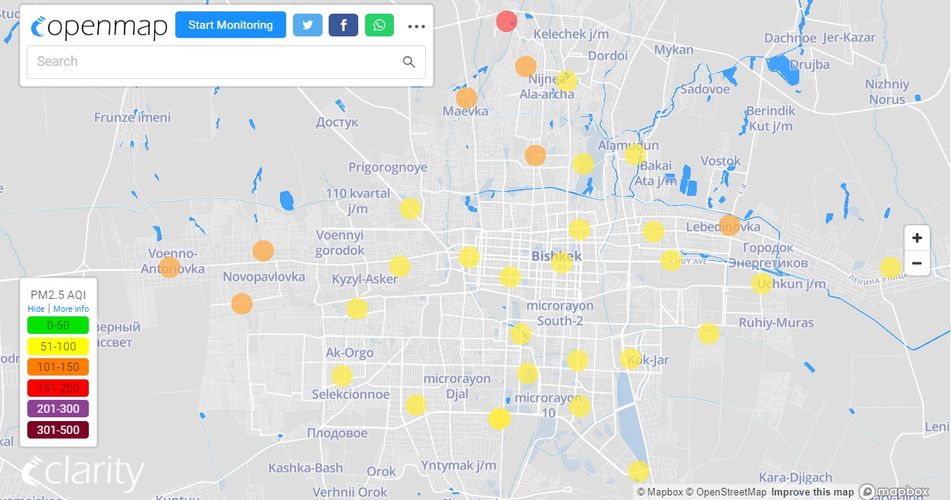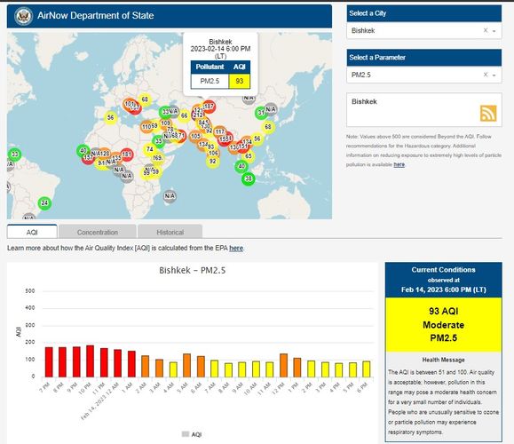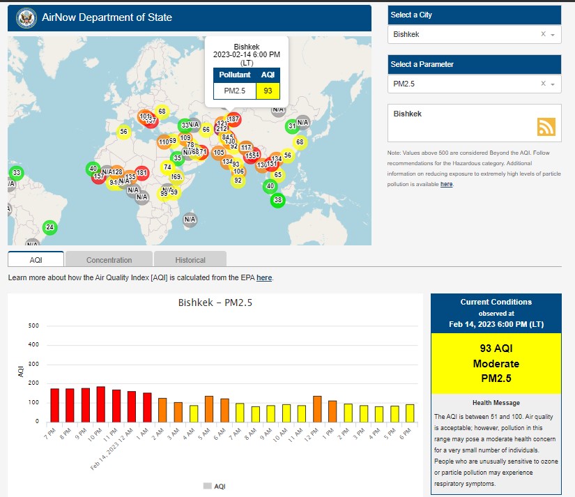Посольство США в Кыргызстане также установило станцию. Информация обновляется каждый час. Индекс качества воздуха в районе дипломатической миссии «умеренный» —93 (AQI).